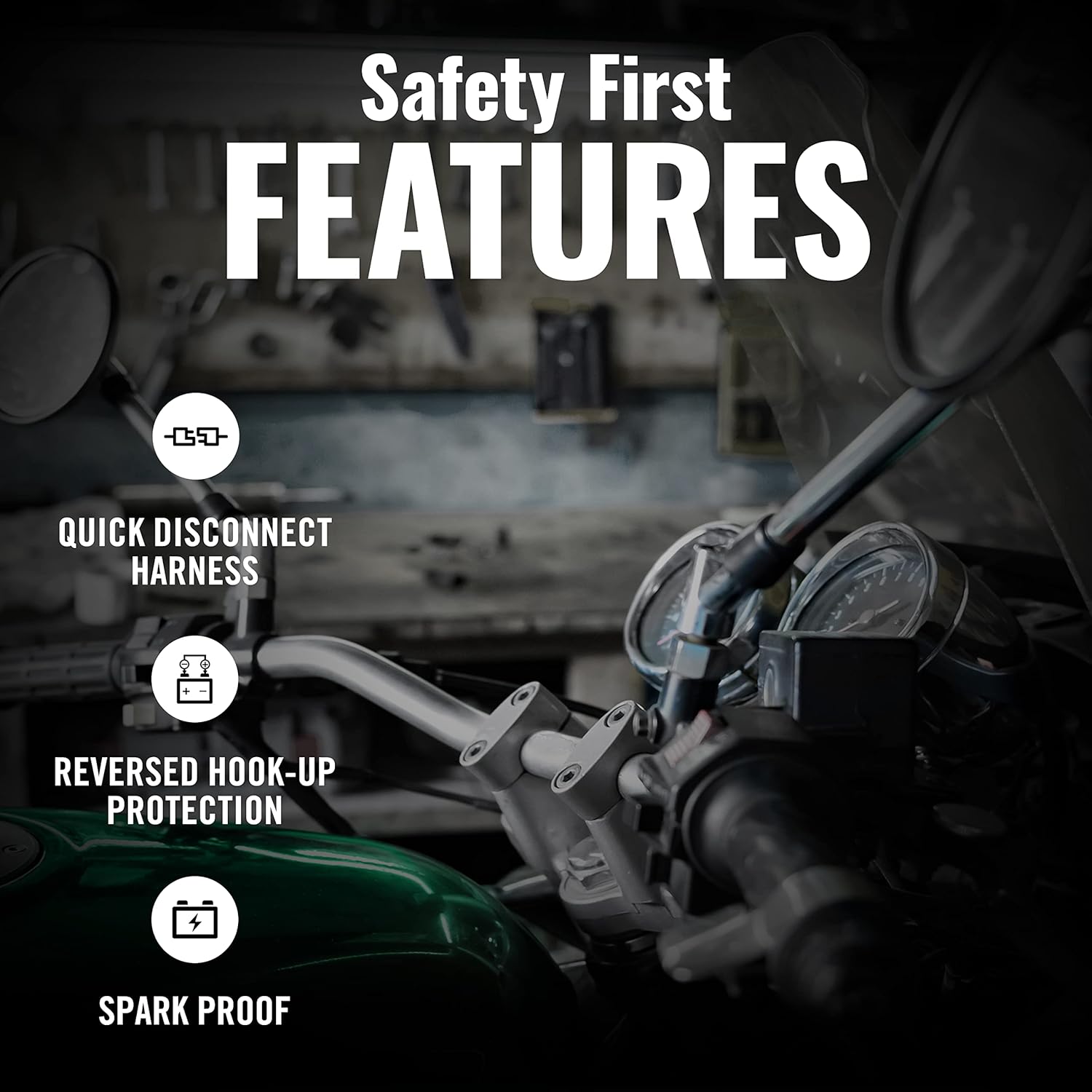 - Safety Features: This battery charger features reverse polarity protection, a 25-hour safety timer shutoff, and is designed for spark-proof operation