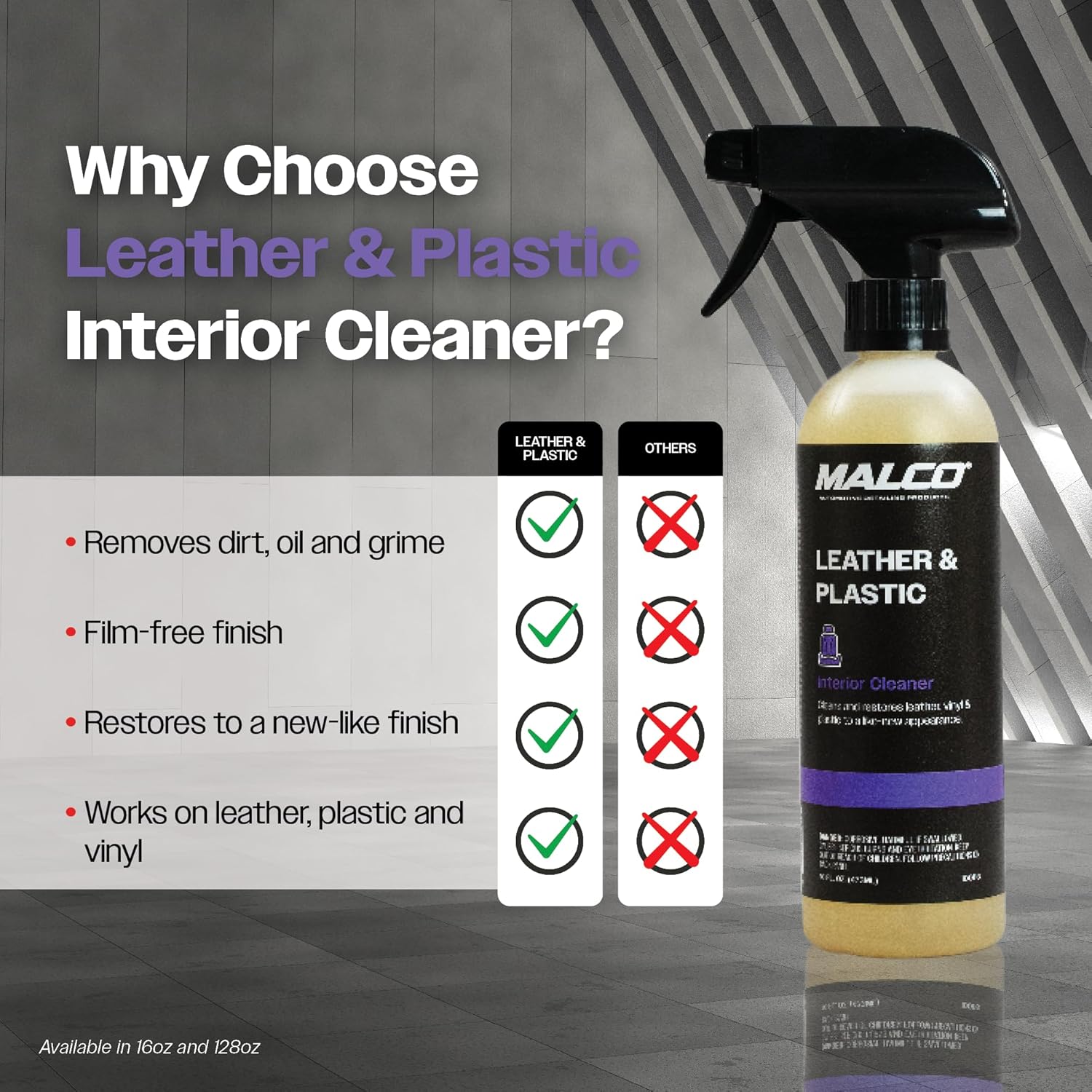 Malco Leather & Plastic Cleaner – Penetrates Deep to Remove Dirt, Grime and Oily Soils/Restores Leather, Plastic and Vinyl/Leaves Surfaces Clean, Shiny and Film-Free / 1 Gallon (100101)