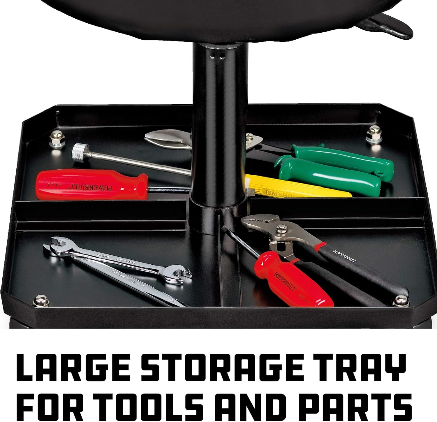 - STORAGE: Large Metal Seat Base Doubles as A Storage Tray for Tools, Parts and Other Loose Items.