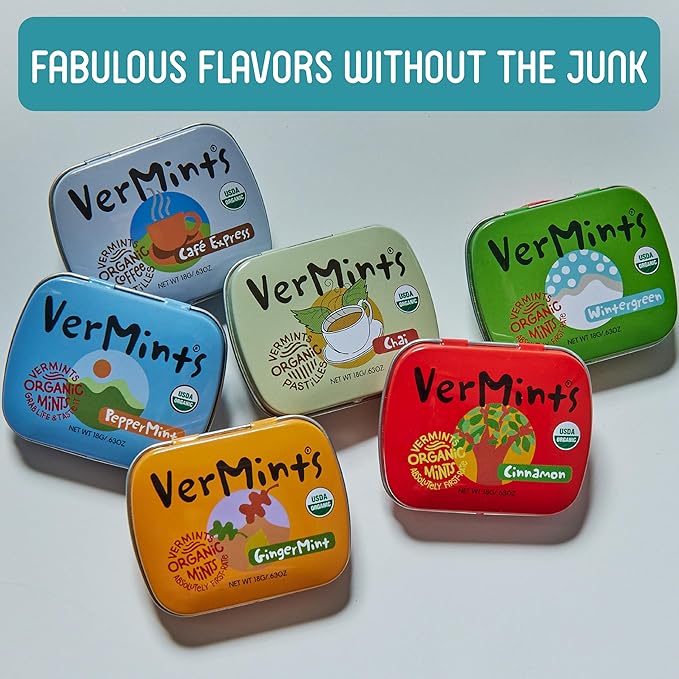 VerMints Organic Breath Mints Wintergreen - Real Long-Lasting Refreshment, Travel Size Tin - Non-GMO, Vegan, Nut Free, Gluten Free & Kosher Organic Candy Mints- .63oz/18g Tins (Pack of 12)