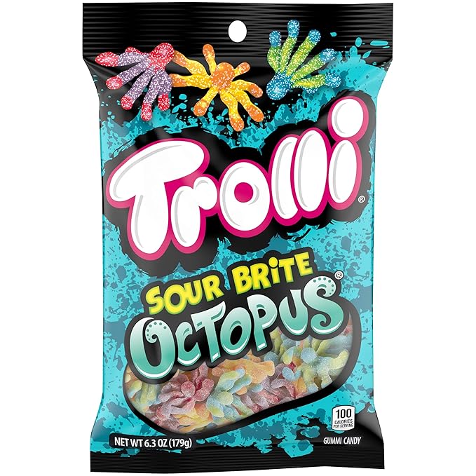 - STOCK UP ON SOUR GOODNESS: Serve up a treat that makes candy fans scream with delight with Trolli Sour Brite Octopus. Jam-packed with 8 packs of sour chewy candy goodness, this big bag of candy is sure to go a long way. Fill party candy bags, your candy bowl at home, or use some octopi for a unique treat with a sweet and sour mix of flavor.