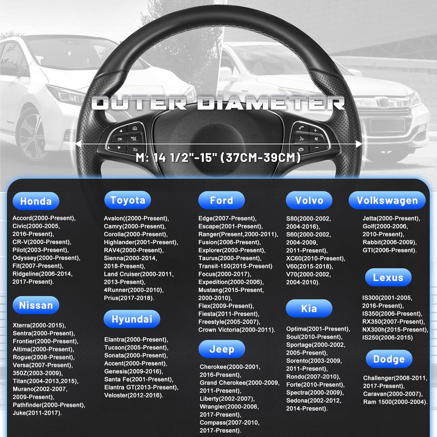 - READY TO INSTALL: Warm up the steering cover, and slip it on your steering wheel. Installation is fairly easy, any adult can install this steering wheel cover. Suitable for standard size steering wheels with outer diameter of 14 1/2-15 inches, please carefully measure the size of your steering wheel before purchasing.