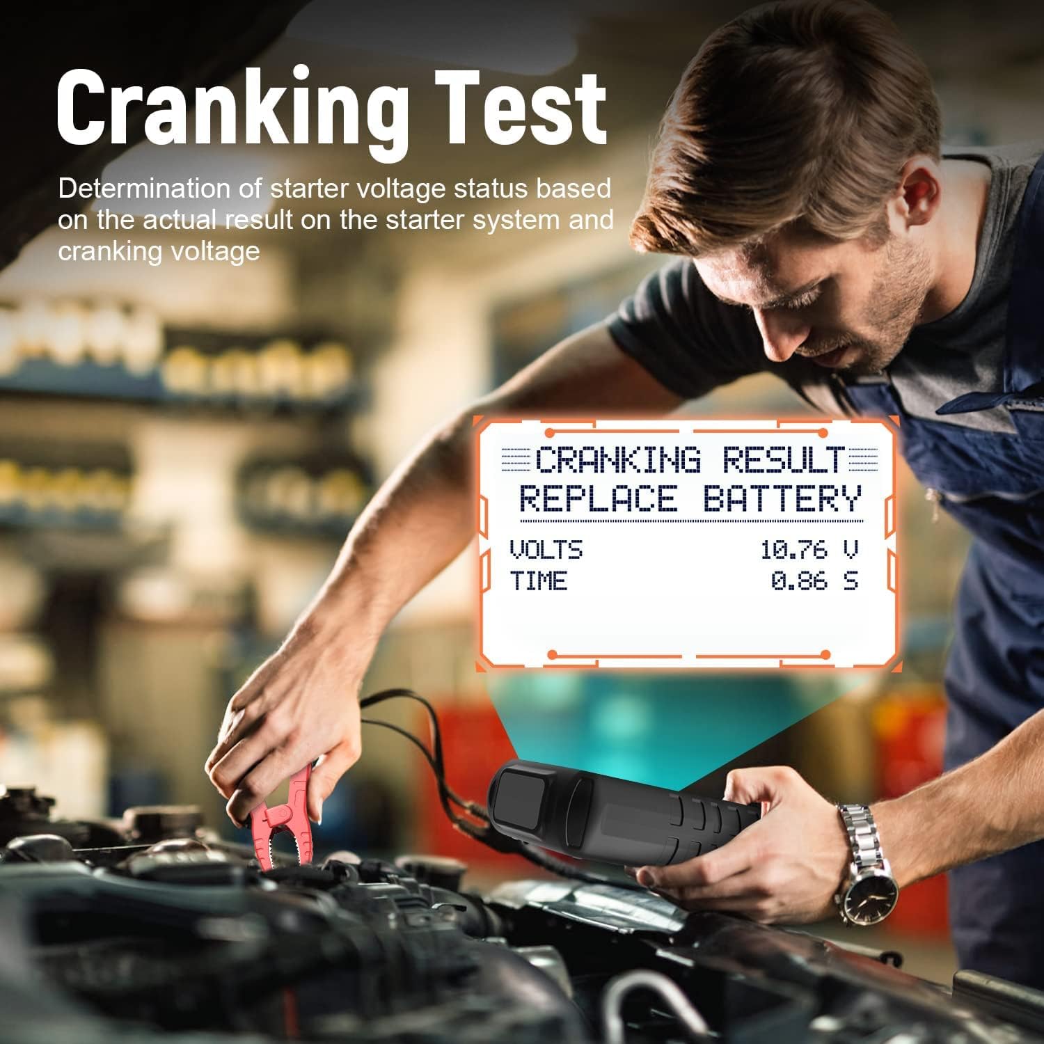 - Cranking & Charging System Test - Even below 0°F, this cold cranking amps (CCA) tester can accurately test the cranking system by turning on the engine and measuring cranking voltage and time. This battery checker tester helps detect weak batteries before failure. If SOH is normal but the car won’t start, check the starter or ignition system. After cranking test, this battery tester auto-switches to charging system test, assessing alternator output voltage, rectifier diode function, and charging current to identify issues like no output, low output, high output, or excessive ripple.