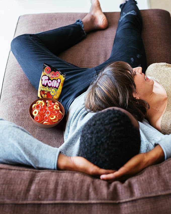 - TROLLI PEACHIE O'S GUMMY CANDY: Everything's just peachy when you're snacking on Trolli peach gummy rings. With a sour, sugar coating these make a perfect, fruity, mouth-puckering treat. Also great for baking or topping your favorite frozen dessert!