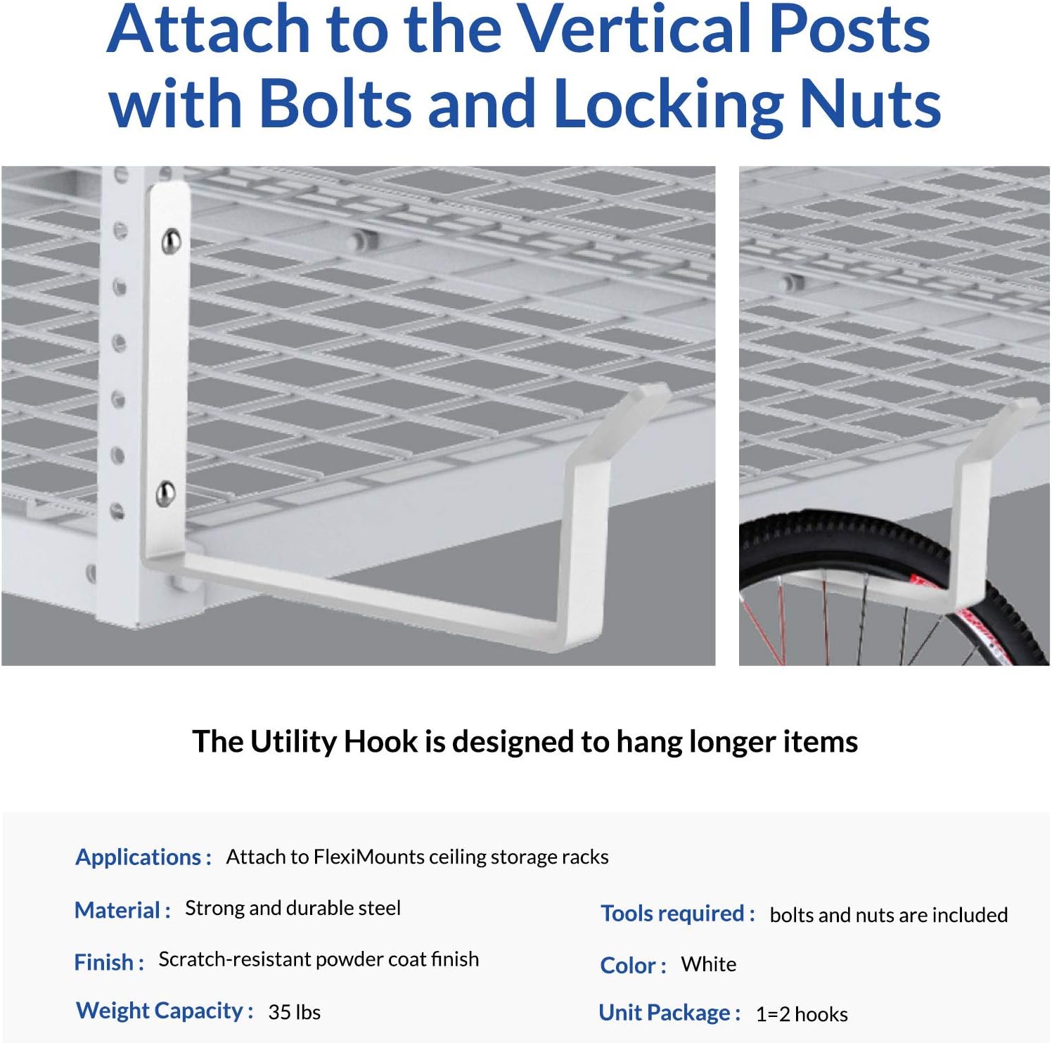 FLEXIMOUNTS 2 Pack Add On Storage Utility Hook Accessory for Garage Ceiling Rack, Max Weight Capacity up to 35lbs,White