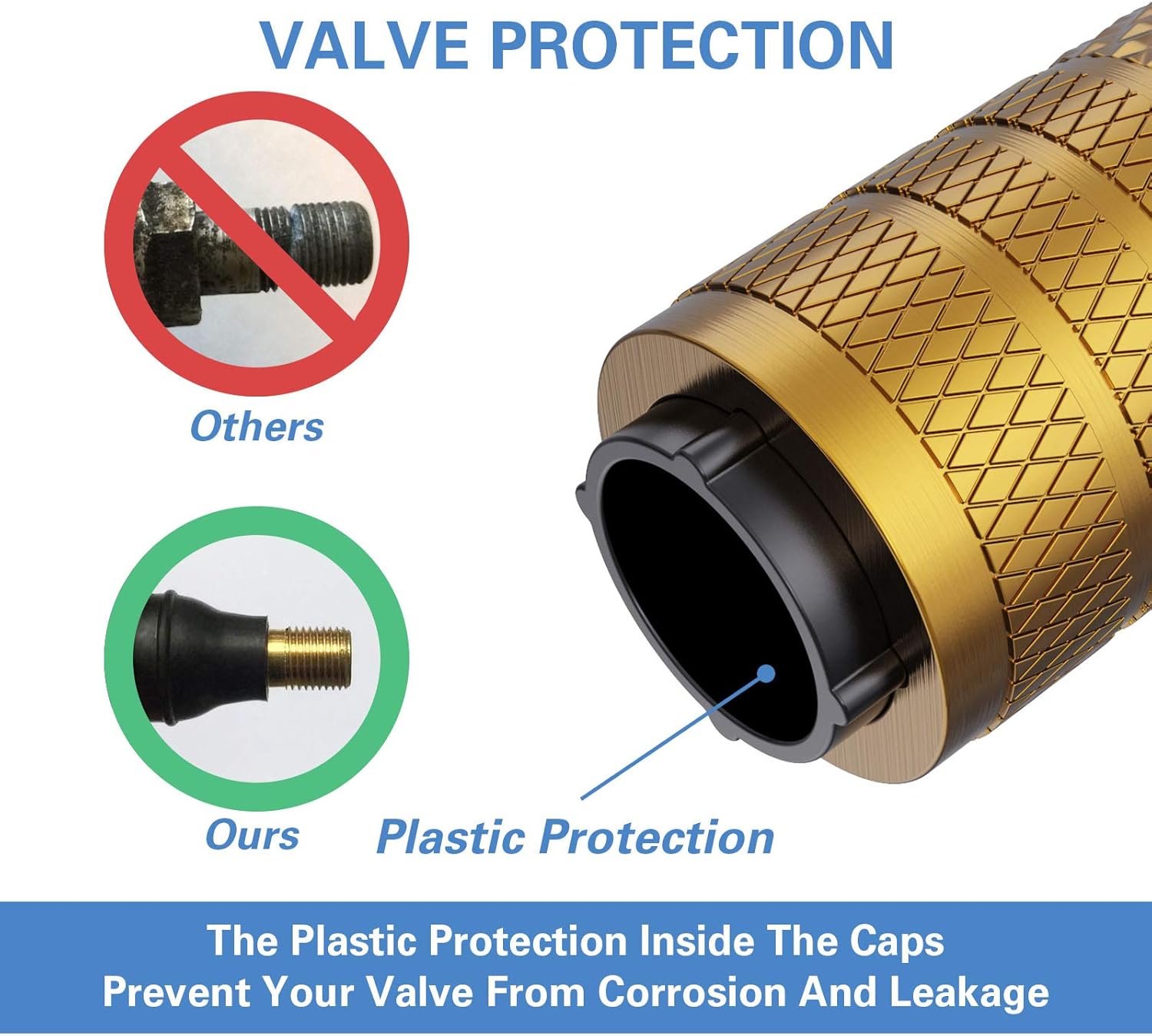 - Special Design β Metal materials are prone to rust in the presence of water and oxygen, which may lead to corrosion on valve body. The plastic inner valve caps design combines the attribution of corrosion resistance of plastic and the stylish look of metal