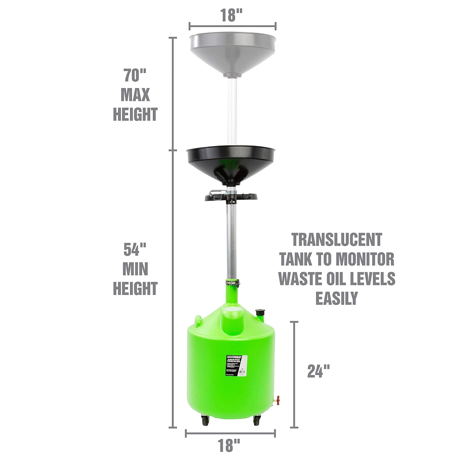 - Large 18-Inch Funnel: The wide funnel ensures efficient oil capture, reducing spills during oil changes. Ideal for quick, clean, and hassle-free oil drains.
