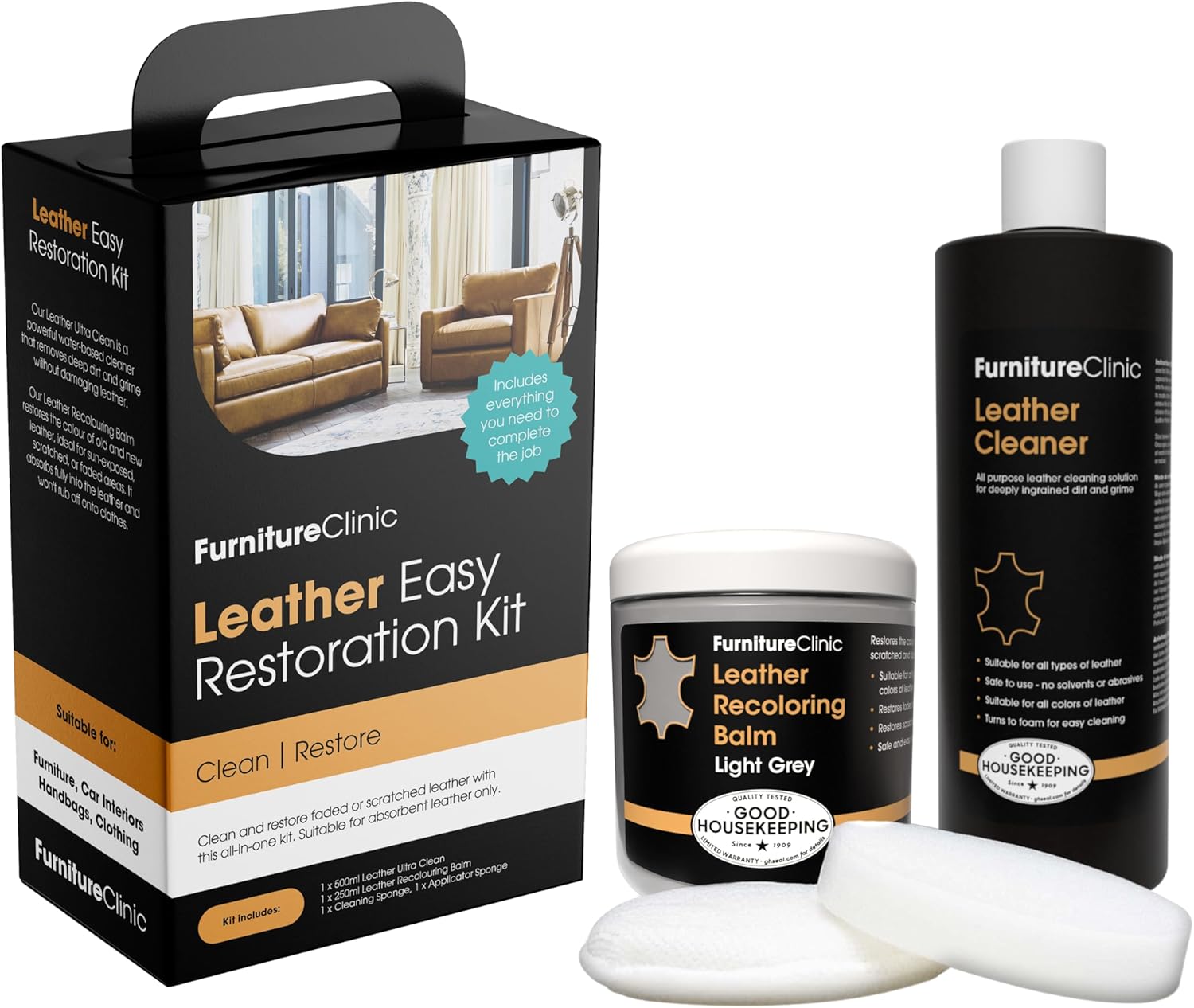 Furniture Clinic Leather Easy Restoration Kit | with Leather Recoloring Balm, Cleaner, Sponge, and Cloth | Leather Repair Kit for Scratched and Faded Furniture (Light Grey)