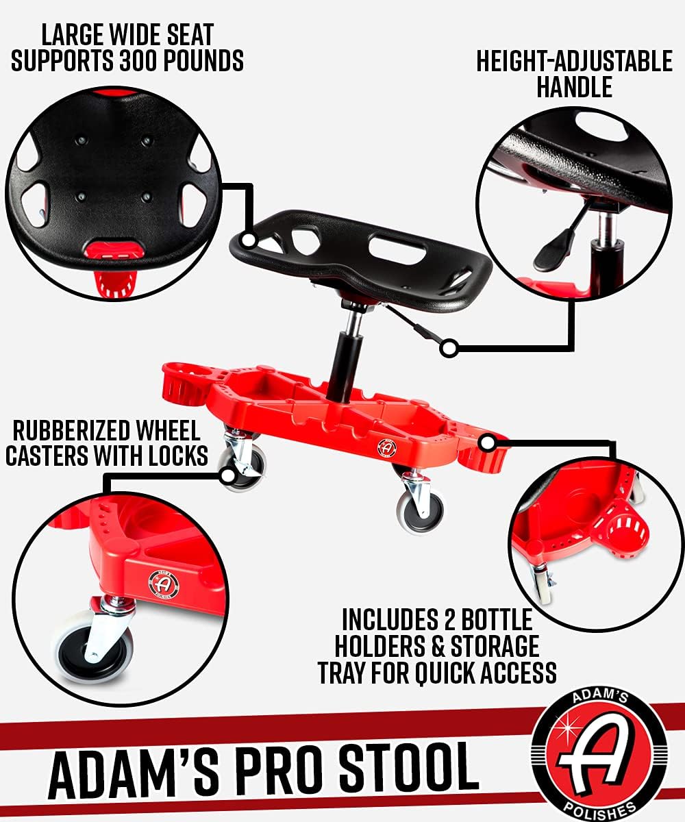 - ✅ AN ESSENTIAL DETAILING TOOL FOR YOUR GARAGE! - Do you desire simplicity in your car detailing routine or while performing mechanical repairs? Introducing Adam’s Detailing Stool! This is the perfect roller chair equipped with a sliding undercarriage storage bay for all your car cleaning supplies!
