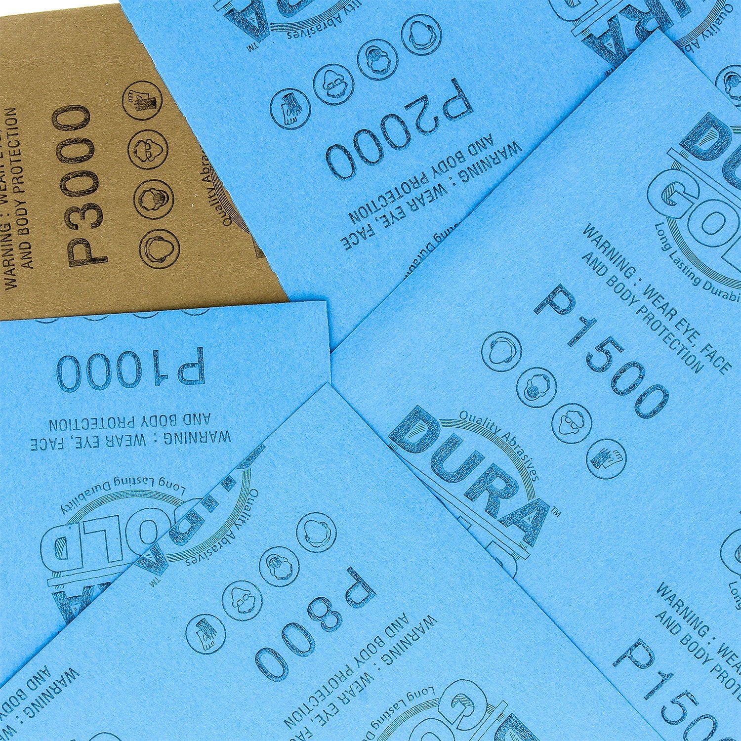 - Variety Pack Box of 25 Dura-Gold Premium 5-1/2" Wide x 9" Long Wet or Dry Sandpaper Sheets. Pack includes 5 sheets each of 5 different sanding grits: 800, 1000, 1500, 2000, and 3000 Grit. These high-performance, durable wet or dry sanding sheets are flexible when used wet and will not fall apart, tear, or crumble while in use.