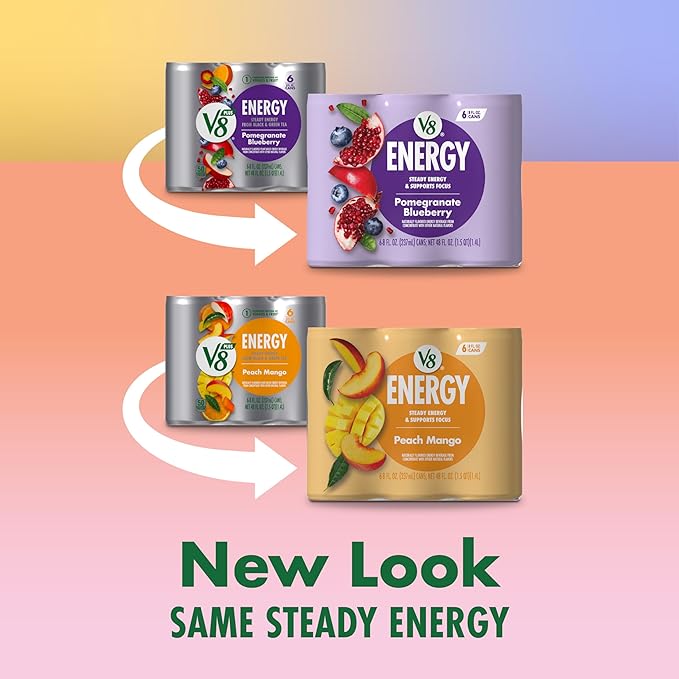 - Variety pack with twelve (12) 8 fl oz cans of V8 Energy Pomegranate Blueberry Energy Drink and twelve (12) 8 fl oz cans of V8 Energy Peach Mango Energy Drink