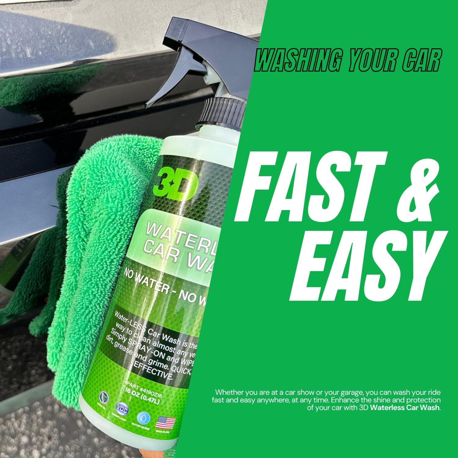 - NO WATER, NO PROBLEM … 3D Waterless Car Wash is our safe and effective car wash cleaning spray that requires no water, bucket, hose, or sponge!