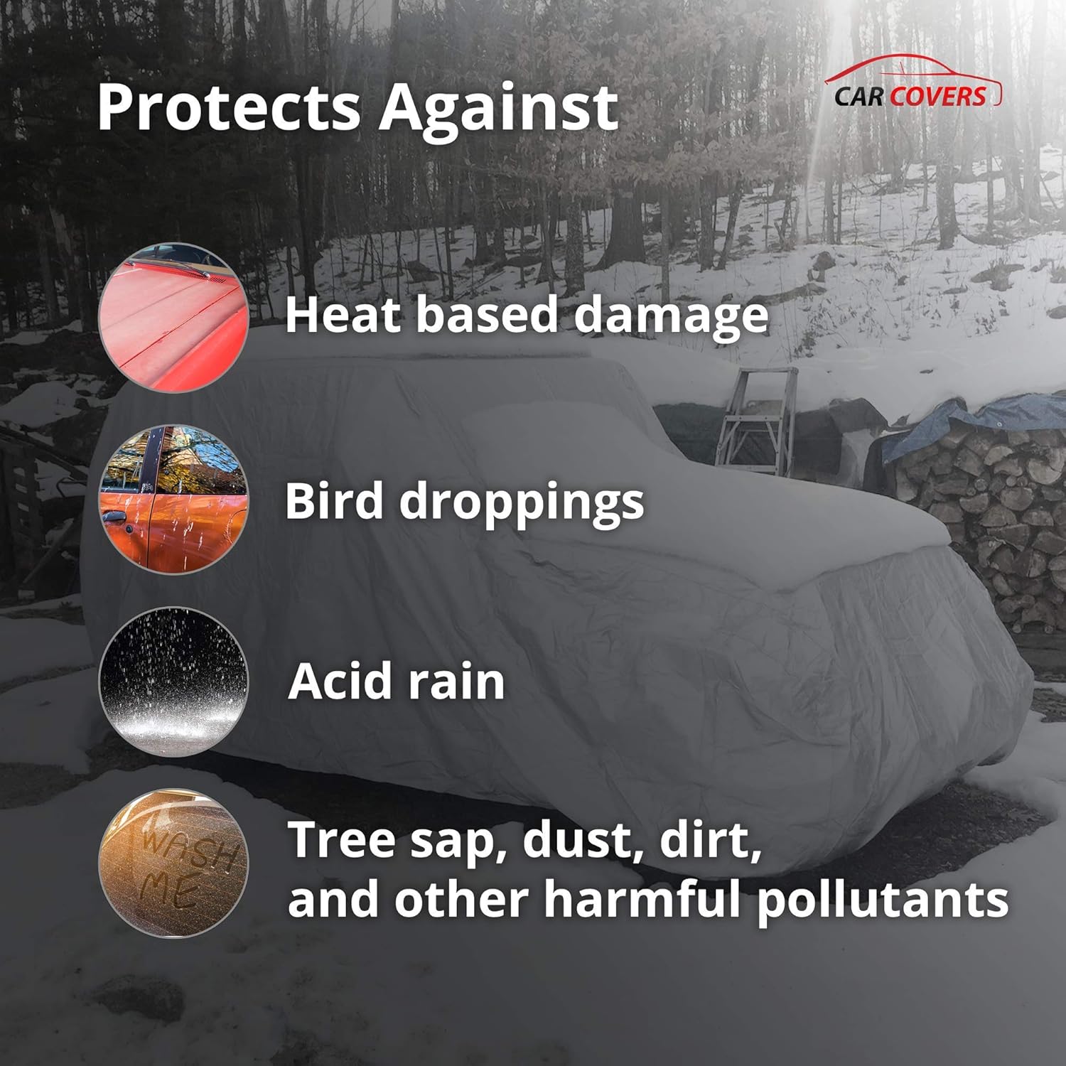 - YEAR-ROUND PROTECTION PREVENTS DAMAGE: Specially made full exterior covers for all indoor and outdoor elements, our top-quality multi-layer truck covers feature breathable interior fabric with double stitched, welded, and reinforced seams and an ultra soft fleece inner lining to protect paint and to ensure your vehicle’s surface finish stays in pristine condition.