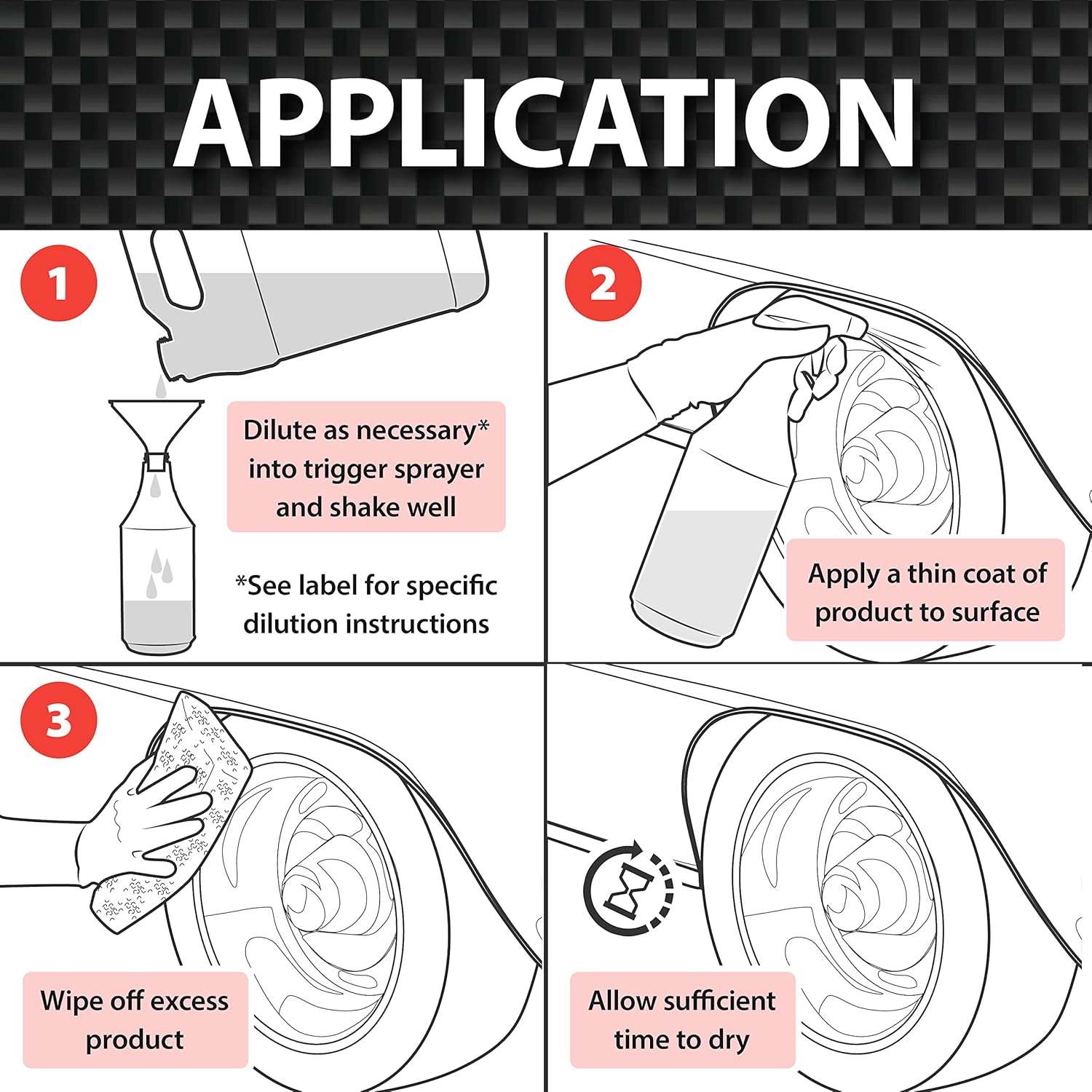 - VARIABLE, HIGH-GLOSS SHINE: Aqua Bead is three dressings in one. Dilute from 1:2 to 1:4 for interior applications, from 1:2 to 1:3 for tires and at 1:3 for engine bays. Read full label and instructions, prior to application.