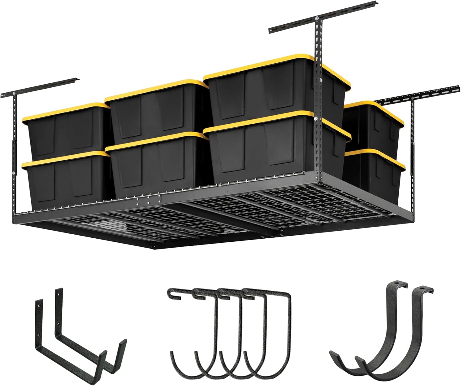 - INDUSTRIAL STORAGE RACK: Our industrial rack is a great fit for virtually any garage. It features a full 600 pound weight capacity and adjustable height ranging from 24 to 45 inches from the ceiling. Store storage bins with ease with our hanging storage rack.