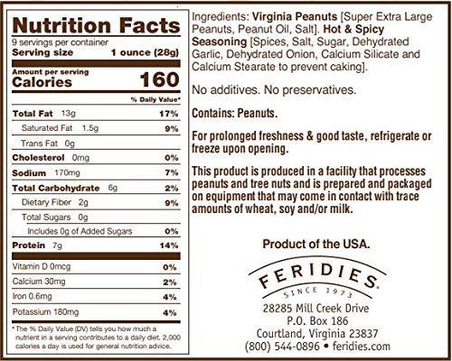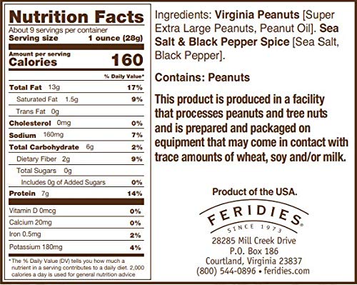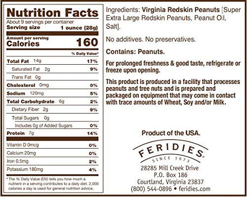 - SUPERIOR QUALITY - FERIDIES Virginia Peanuts are cooked in pure peanut oil and lightly salted to maintain the peanuts distinctive flavor and healthy qualities.