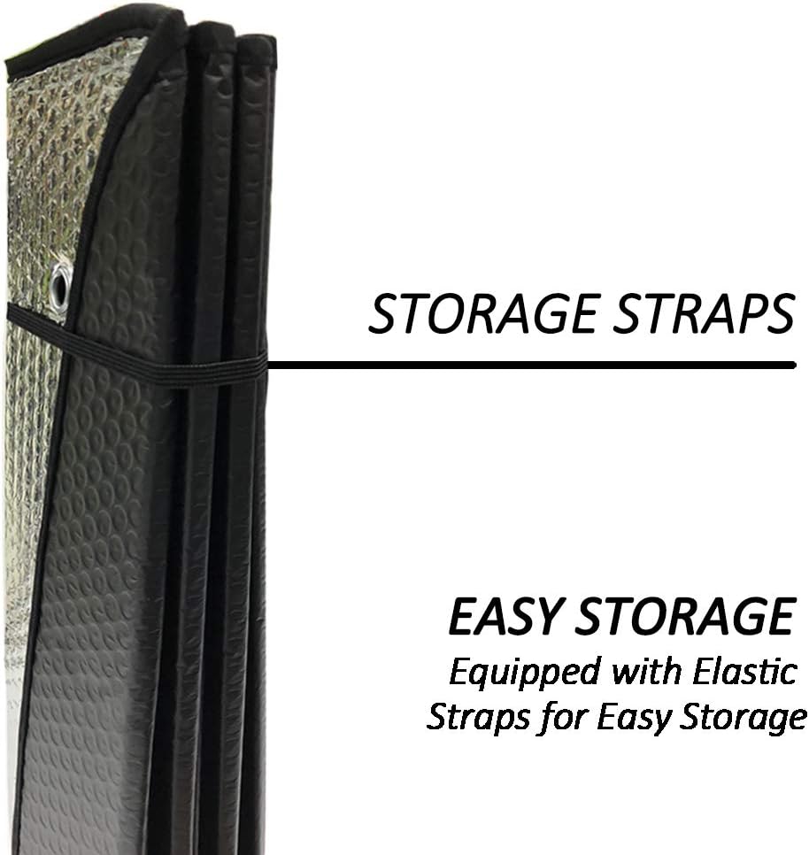 - Double Bubble Silver Coated - Keep from 99% UV Ray Damage,windshield sun shade is a great barrier for hot sun! Keep cool on your car seat or dashboard,bring your interior as new! Auto front sun shade maintains elegant Interior with black design. For driver in summer, sun shade car/ car sun shade for windshield as a good helper!