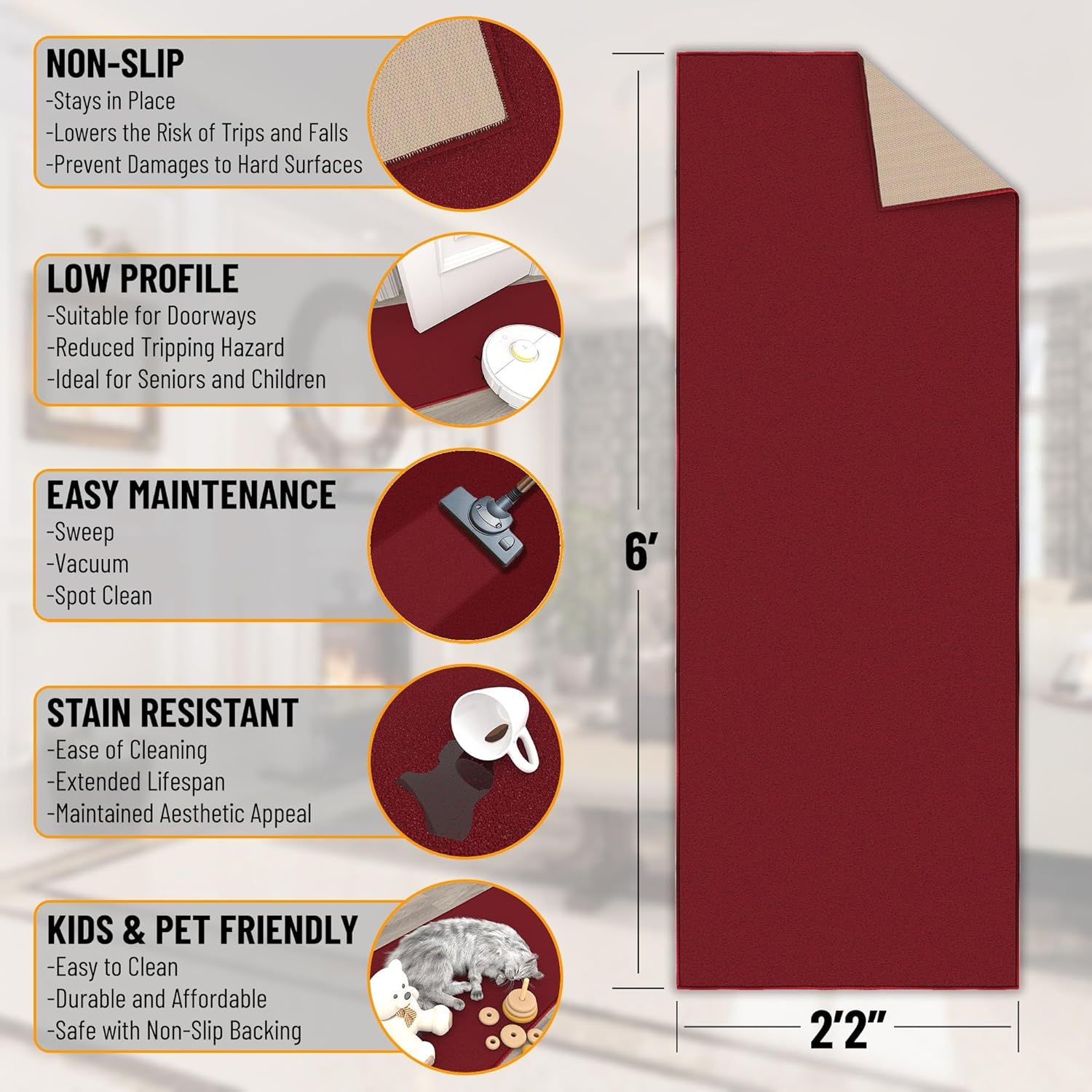 - [Slim 0.2-Inch Profile Clears Doors]: Low-pile construction allows for smooth door clearance and easy furniture placement—perfect for hallways, kitchens, and transitional spaces.