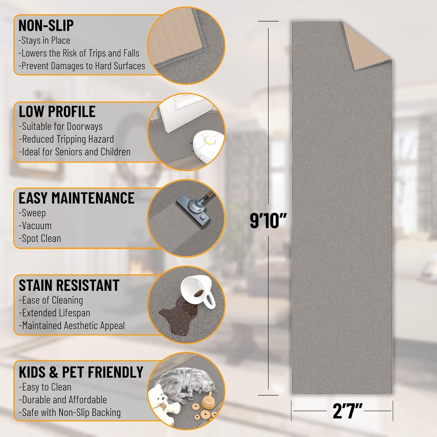 - [Slim 0.2-Inch Profile Clears Doors]: Low-pile construction allows for smooth door clearance and easy furniture placement—perfect for hallways, kitchens, and transitional spaces.
