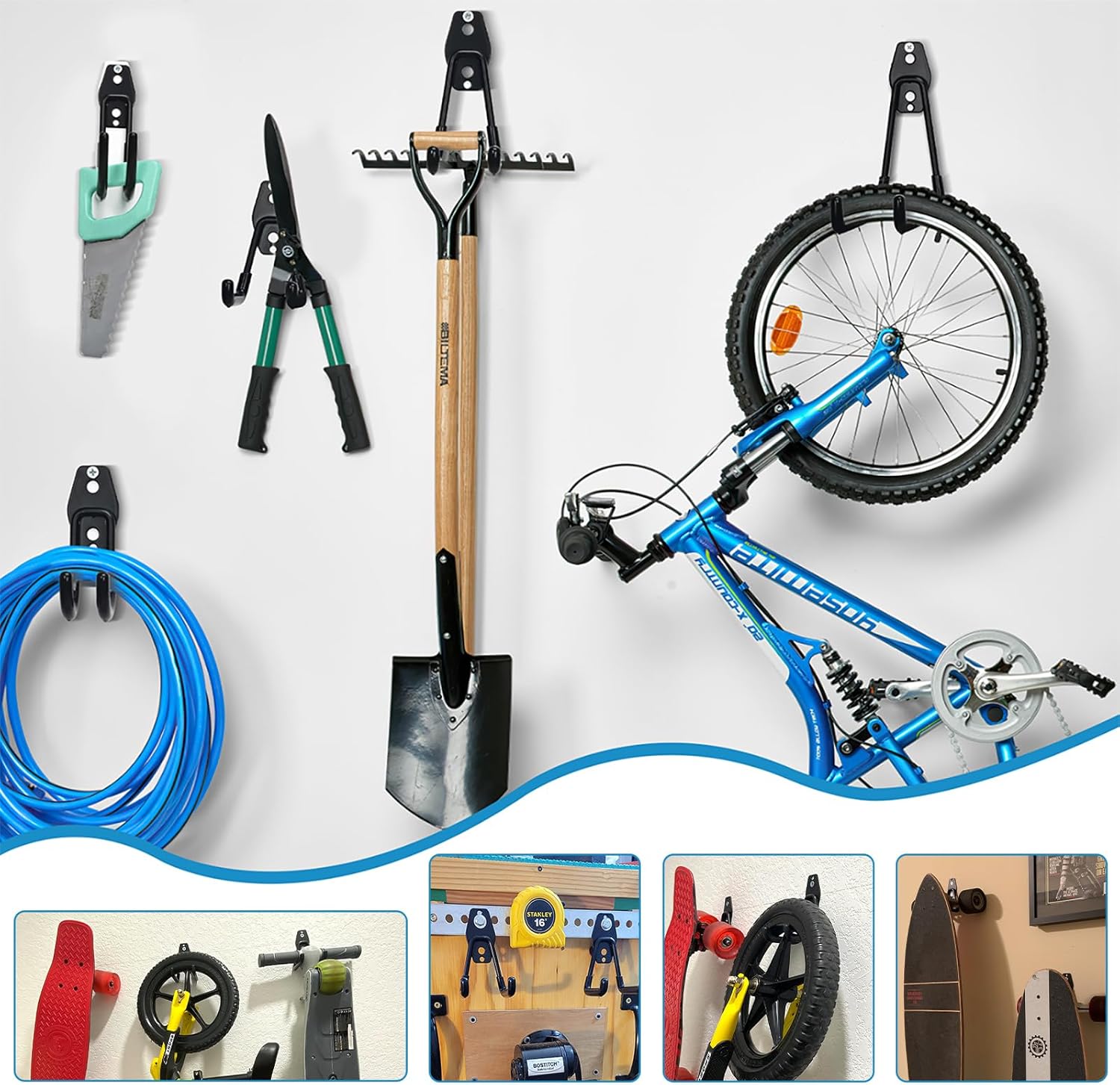 - 【VARIOUS FUNCTIONS】Large Hook is a flexible wall mounting solution for bikes, cables,hoses, spade, broom, wrench, stroller, skates, gym bags, shovel, rakes, kayak, sports equipment, sawhorses, and electrical cords,gym bars, Body Training and core strength builders and other items.