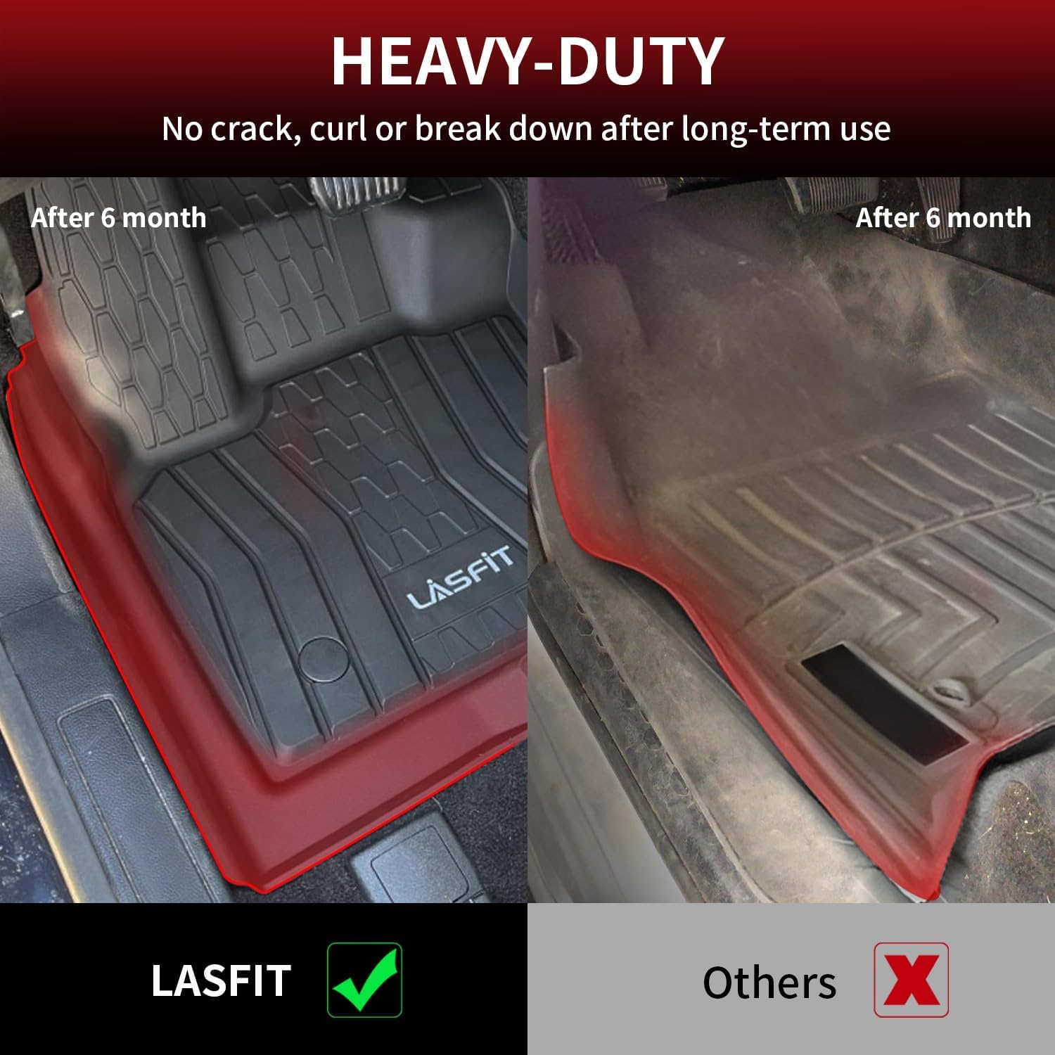 - ăEASY INSTALLATION & MAINTENANCEăDesigned for effortless installation and removal.The anti-slip buckle design aligns with the vehicle's original floor positions, ensuring a secure fit. LASFIT floor mats are stain-resistant, waterproof, and easy to clean. Simply wipe with a damp cloth or remove and rinse with water for a quick refresh.
