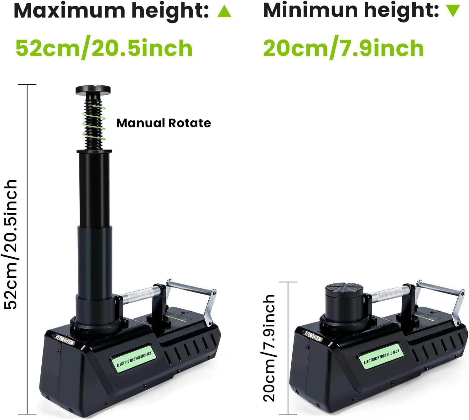 - ăPowerful Electric JackăThis 12V DC car jack has a loading weight of 15 tons and a lifting range of 200mm-520mm/7.9-20.5in, making it a good helper for vehicle maintenance.