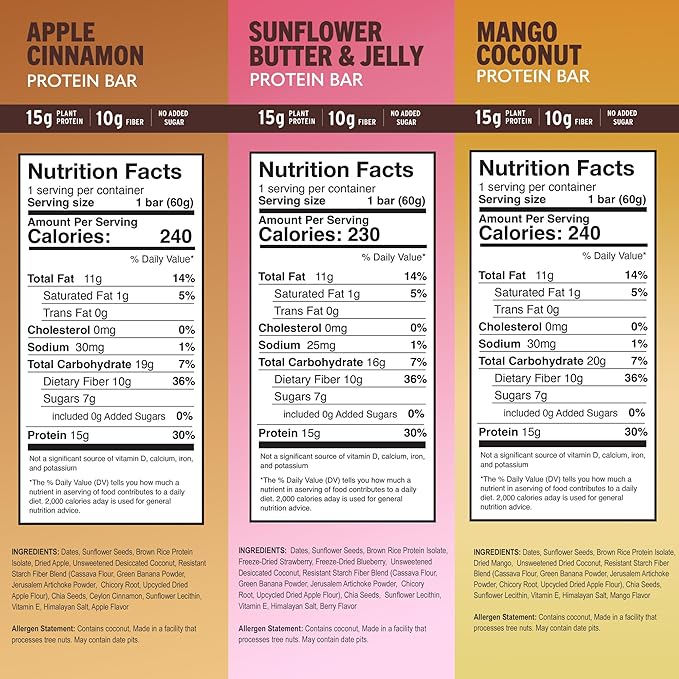- 6 Mouthwatering Flavors – Our Protein Bar Variety Pack features crave-worthy tastes: Chocolate Chip Coconut (2), Chocolate Brownie (2), Dark Chocolate Crunch (2), Apple Cinnamon (2), Sunflower Butter & Jelly (2), Mango Coconut (2)