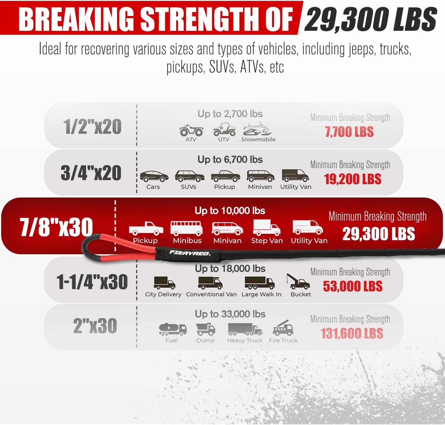 - FIERYRED Kinetic Recovery Rope features 7/8” thick x 30' long, 33900lbs minimum breaking strength, which is best utilized in anything from 3/4 ton pickup trucks to large SUV's. This Rope is a safer and smoother way to assist stranded vehicles out of mud, sand, water, snow and more.