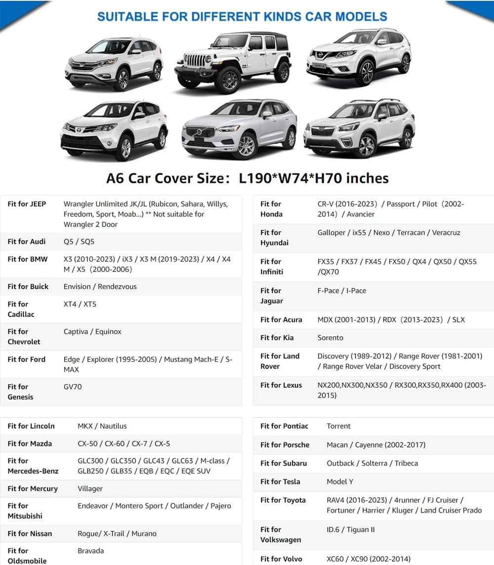 - ăChoose the Right ModelăâŻâŻA6 suitable for jeep and SUV, Length 181-190 inches. (Not for hatchback sedan). For example SUV--Jeep Wrangler, Cherokee, BMW X3, Mazda CX5, Subaru outback, Toyota RAV4, Honda CRV,Bmw X3 X4, Audi q5,Volkswagen tiguan, Lexus rx350/NX200t, Subaru outback, Kia sorento, Hyundai santa fe,Volvo xc60/xc70, Chevy Equinox, Porsche Macan, Mitsubishi Outlander, Lincoln mkx etc.If you are not sure if your model is a good fit, look at the fifth model table in the main figure.