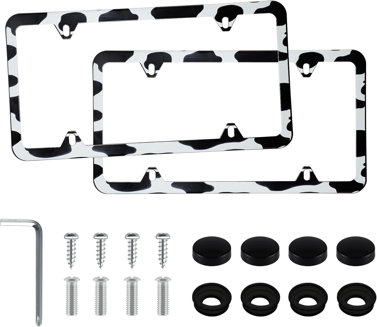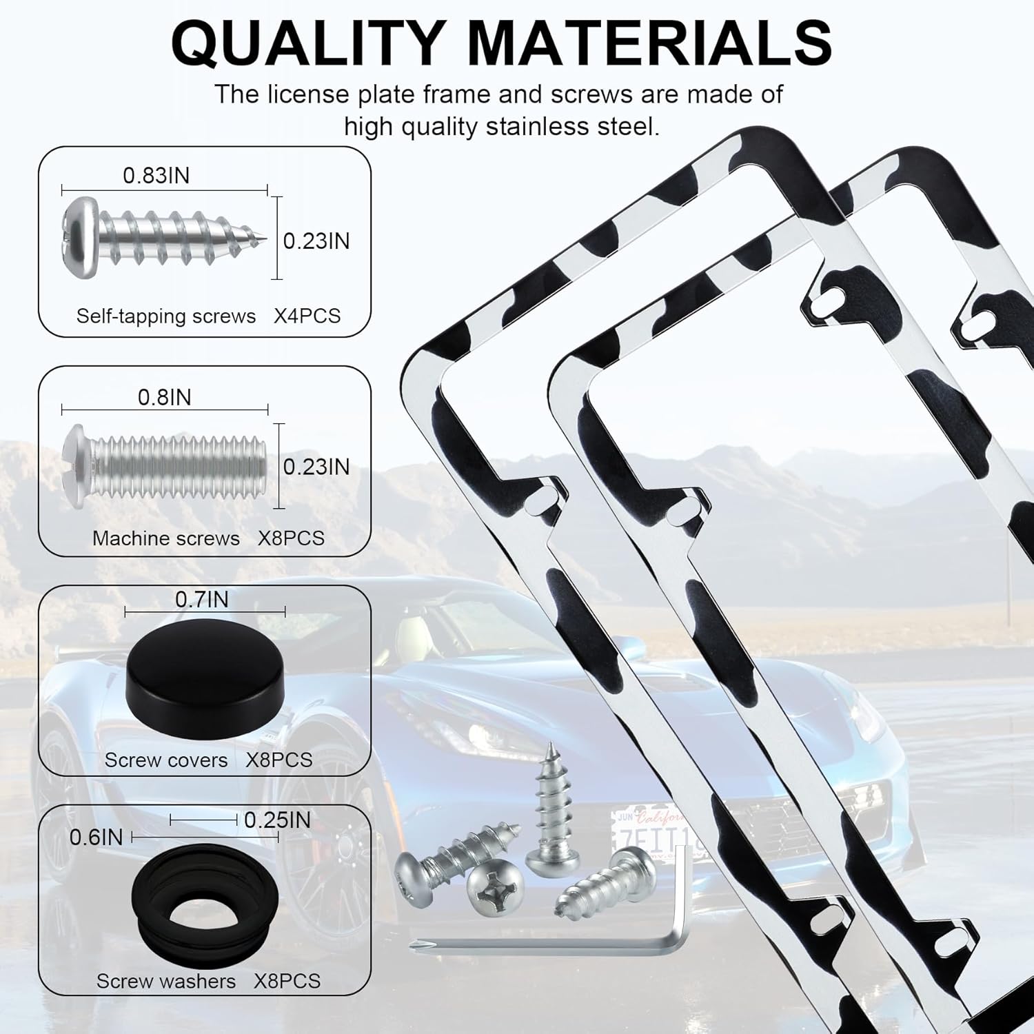 LivTee 4 Holes Stainless Steel License Plate Frames, 2 PCS Car Licence Plate Covers, Automotive Exterior Accessories Slim Design with Bolts Washer Caps for US Vehicles, Cow Spot