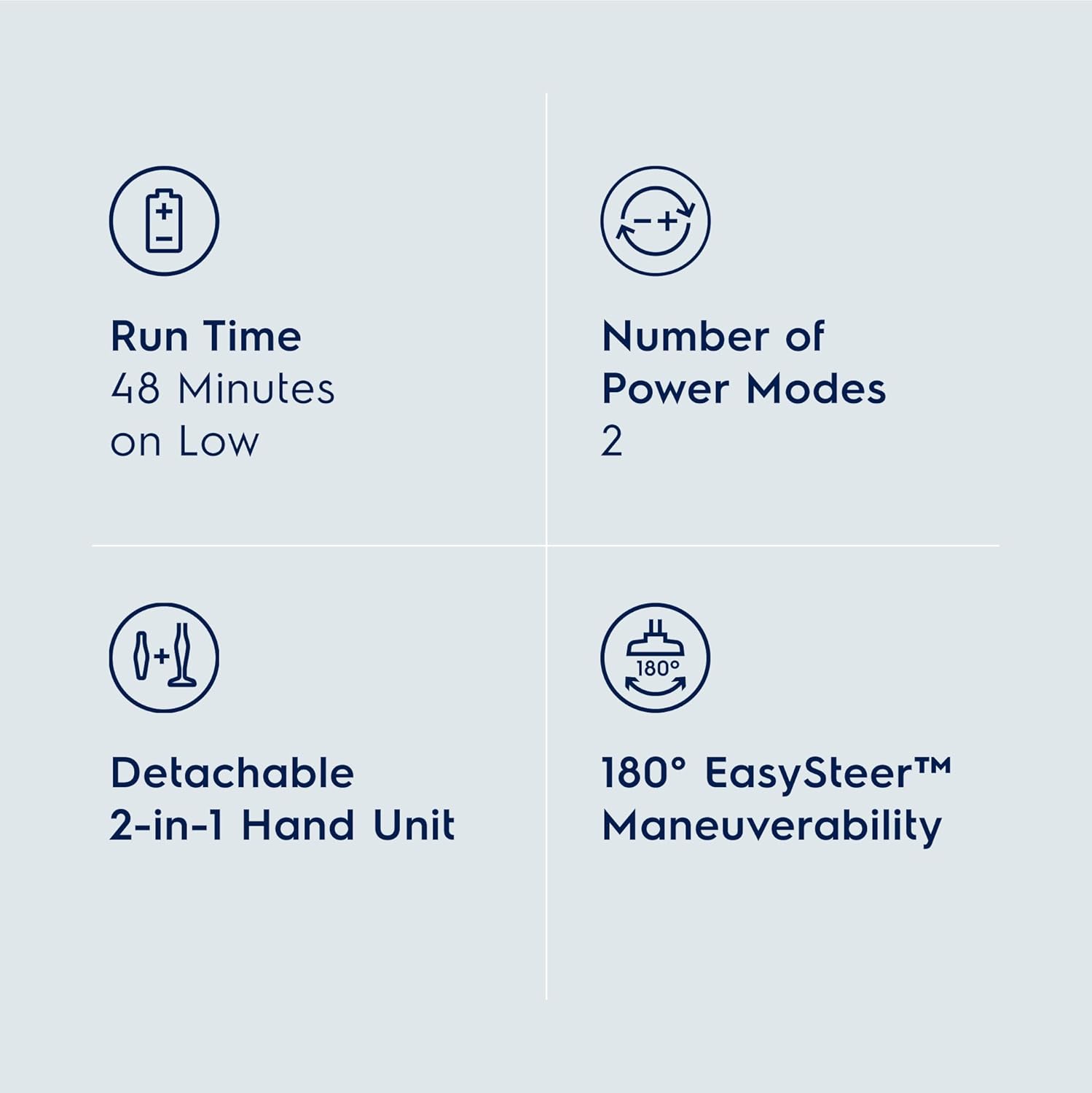 - Enhanced Mobility and Visibility: Effortlessly navigate around furniture and obstacles with 180Β° EasySteer maneuverability as bright LED nozzle lights illuminate tight, dark spaces for a more thorough clean