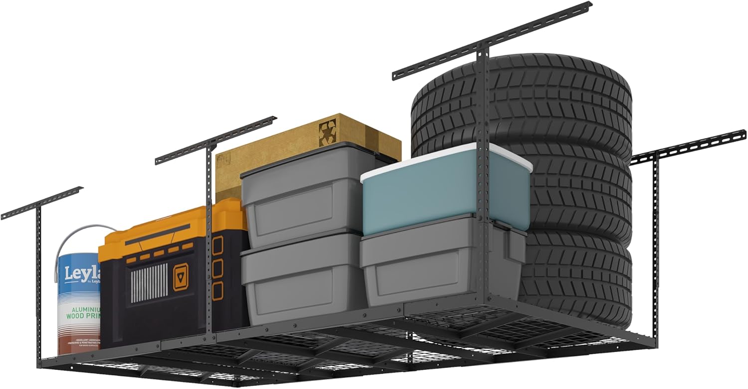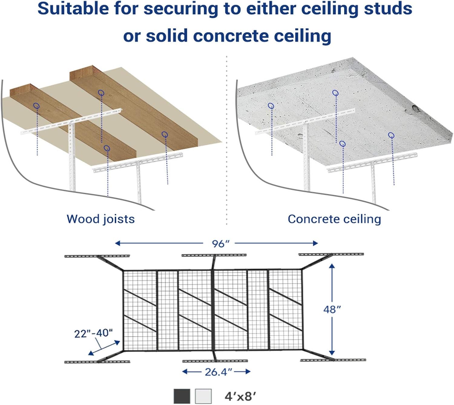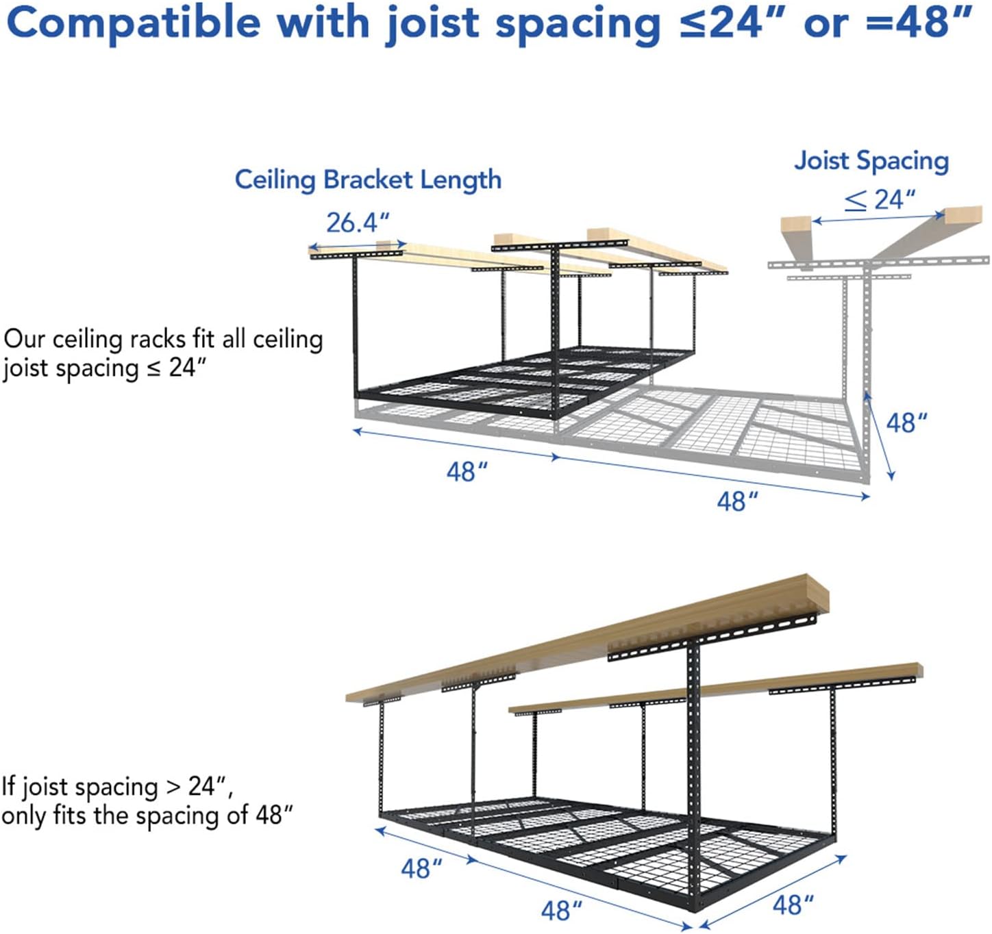 - DIY INSTALLATION:Installation template helps make plan.This overhead storage rack fits all ceiling joist spacing β€ 24",if joist spacing > 24",only fits the ceiling spacing of 48".