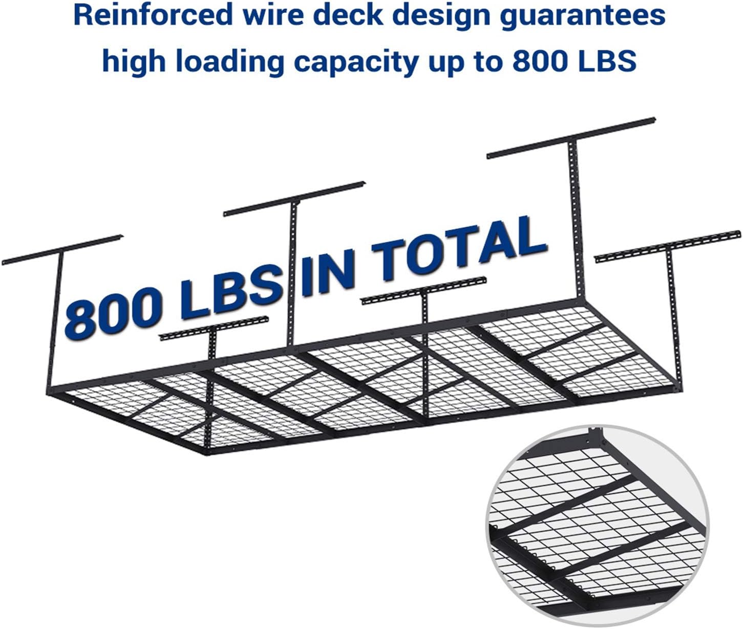- 1600 lbs Tested, 800 lbs Rated: Our overhead garage storage rack undergoes rigorous double load testing (1600 lbs) to ensure unmatched safety and durability, supporting up to 800 lbs for your tools and equipment.
