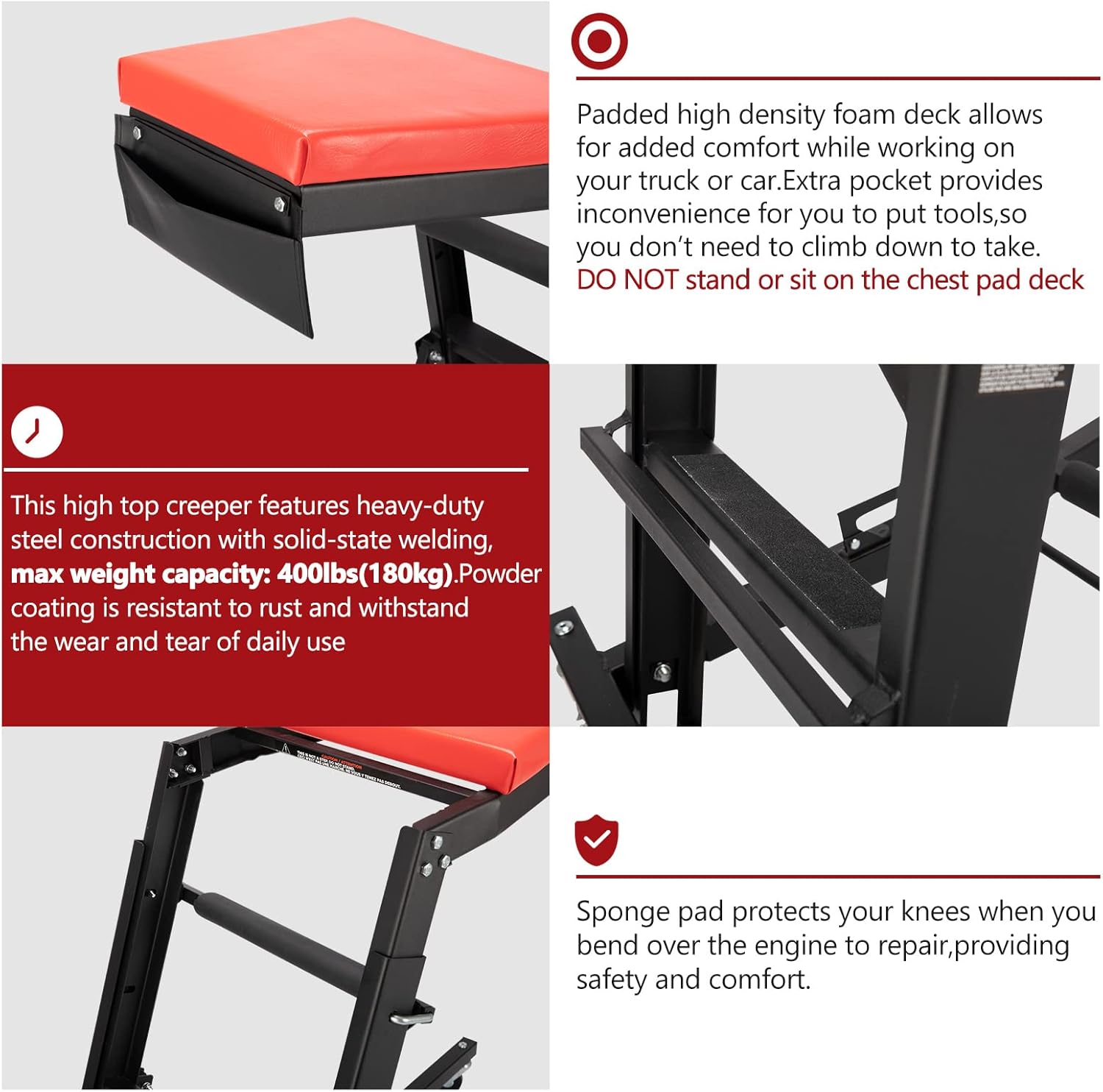 - HEAVY DUTY CONSTRUCTION: This high top creeper features heavy-duty steel construction with solid-state welding,max weight capacity: 400lbs(180kg).Powder coating is resistant to rust and withstand the wear and tear of daily use.
