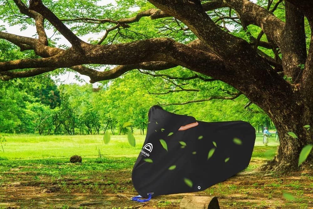 - Perfect Design: 1. with 2 anti-theft woven lock holes at front, security anti-theft. 2. windproof elastic strap with S shape hooks in the middle to fix your motorcycle in heavy wind weather. 3. reflective stripes to clearly see the location of the vehicle in the evening and prevent collision. 4. breathable air vents to reduce moisture accumulation and allows for the circulation of air to keep the inside dry. 5. comes with a large enough storage bag, easy to carry.