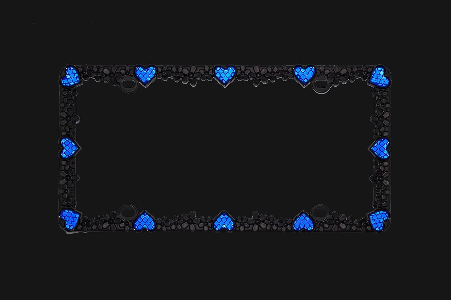 Creathome 3D Daisy Heart License Plate Frame from Pure Zinc Alloy Metal Perfect Plate Holder, Matt Black Daisy with Blue Reflective Heart