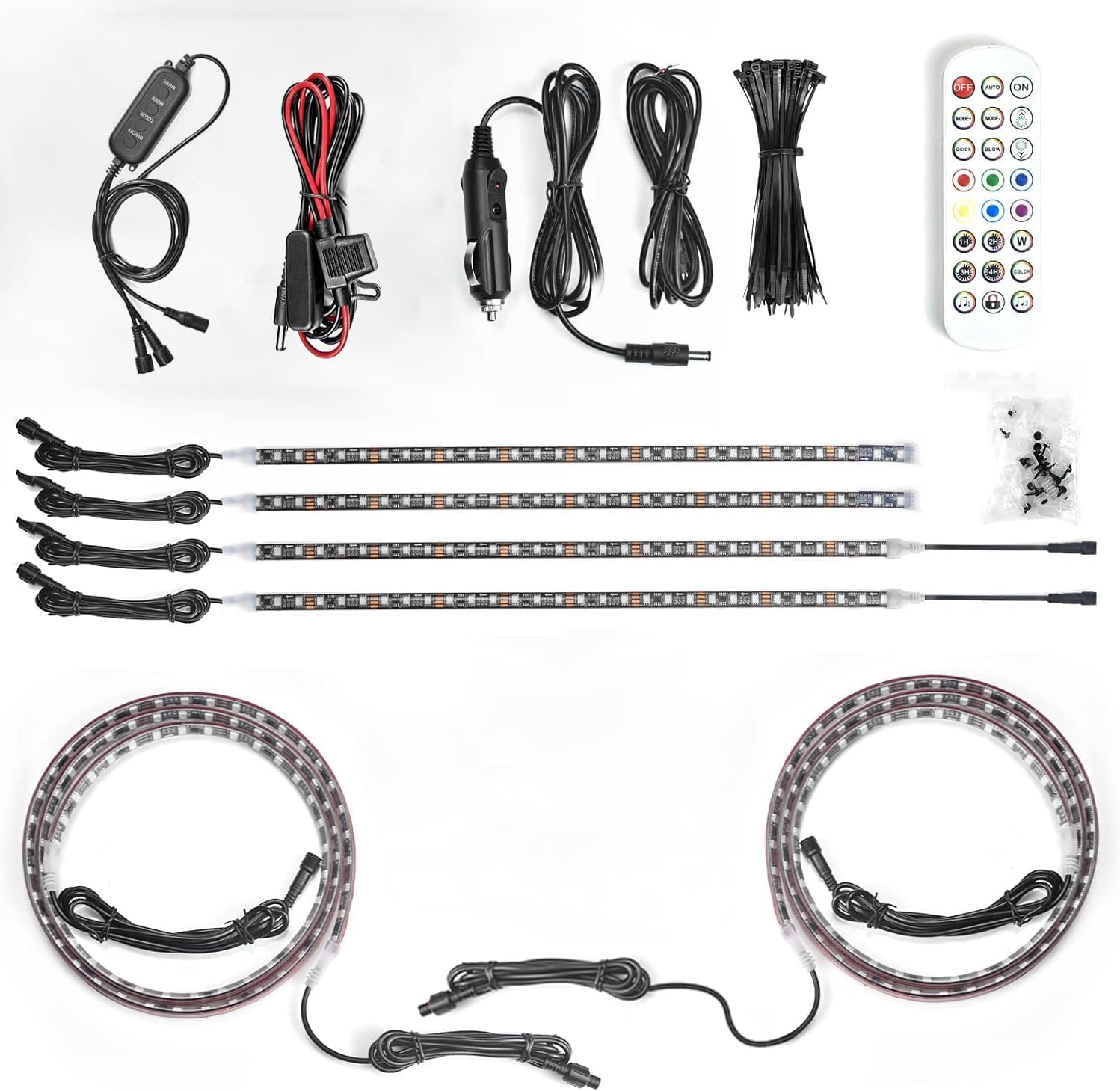 - ăEasy to Installă-The car underglow LED lights are equipped with 2 lines connecting 6 strip lights. 4 x 20.3 inch + 2 x 60.3 inch light strips design . Flexible tubing can be bended around corners easily. Strong 3M adhesive, zip ties even fixing clips and screws equipped it hold it on place firmly definitely. You can install them in various cars, like SUVs, trucks, Jeeps, JK, Vans, Boats, JL, pickup off road, UTV, motorcycle Decorations