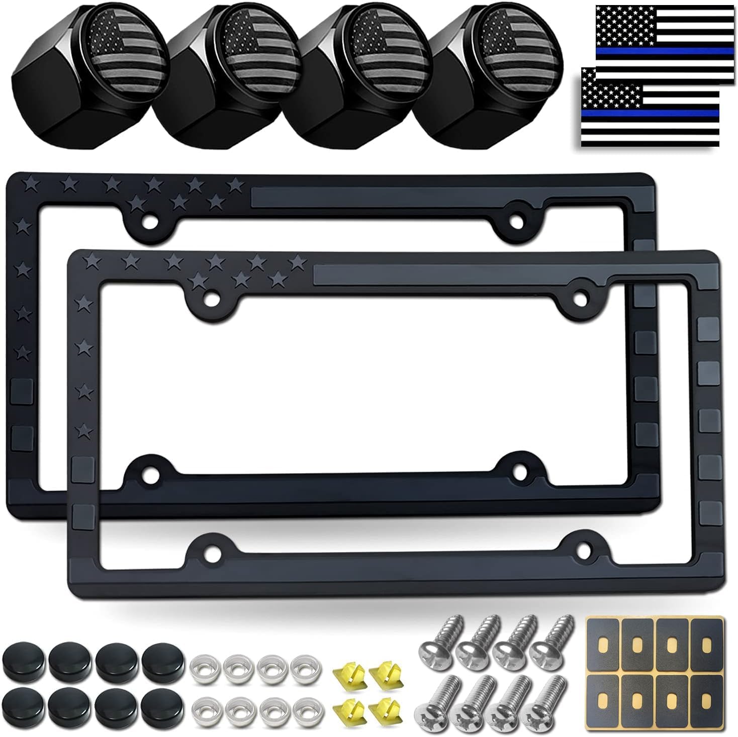 - American Flag Car Accessories: 2 pack thin blue line flag car decal stickers express your support to the police, law enforcement. Made from 3M Vinyl, 2.5" X 4.5", UV & Water & Weatherproof. 4 sets USA flag tire valve caps are made from aluminum alloy, designed in general size 10*16mm, can be installed on tires of bicycle/motorcycle/car, can provide an enhanced seal to avoid leakage and properly keep away from dust, dirt, grime and road debris.