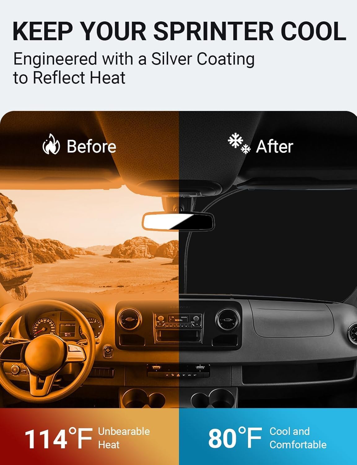 - Certified Sustainable. DESIGNED IN USA!!! Custom Design: The front windshield shade has been custom cut specifically for Sprinter. Precise fit design and Reinforced steel rings make a precise and secure fit to the window, no need to use suction cups to hold it in place. It won't sag or collapse like other car heat shields. Fits for Sprinter 2025 2024 2023 2022 2021 2020 2019 2018 2017 2016 2015 2014 2013 2012 2011 2010 2009 2008 2007.