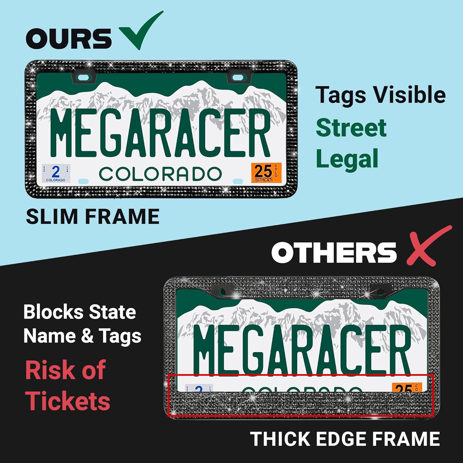 - Slim Thin Edge Design: Add sparkle without hiding your tags! The sleek thin-edge design perfectly fits US standard plates, keeping your tags fully visible and your ride stylish.