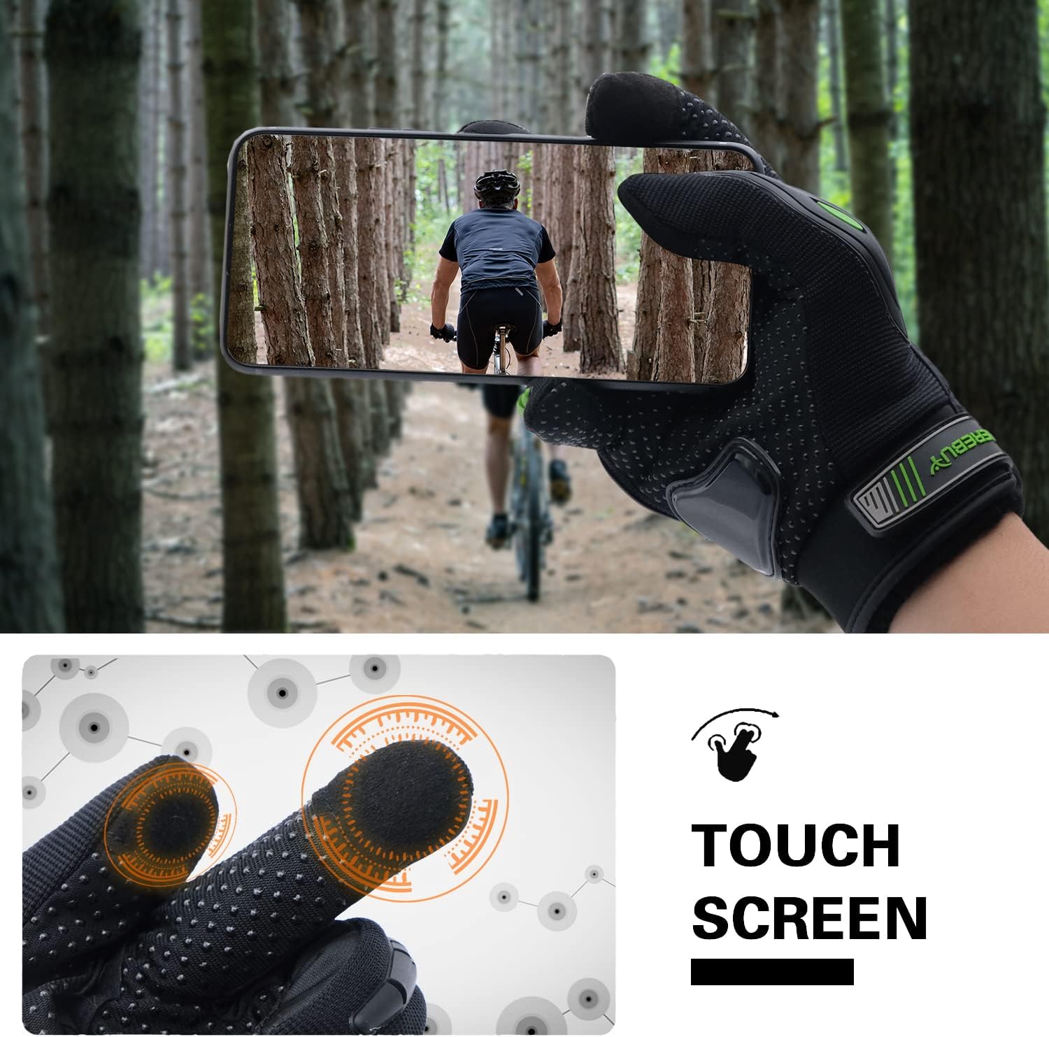 - Touch Screen:Increasing the friendly touching function to thumb and middle fingers part of glove, so you can touch your phone screen sensitively and don't need to take off gloves.