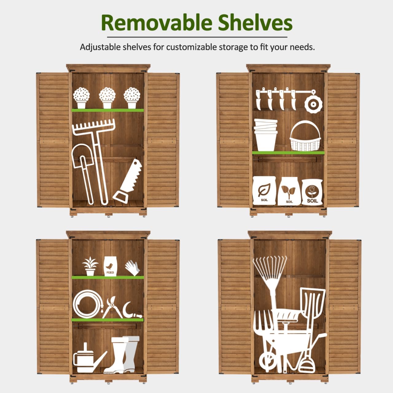 - Fir Wood Material: The vertical storage shed is made of high-quality fir wood, and the exterior has been polished to express a rustic style. Besides, the wooden shed is easy with other dΓ©cor and natural settings.