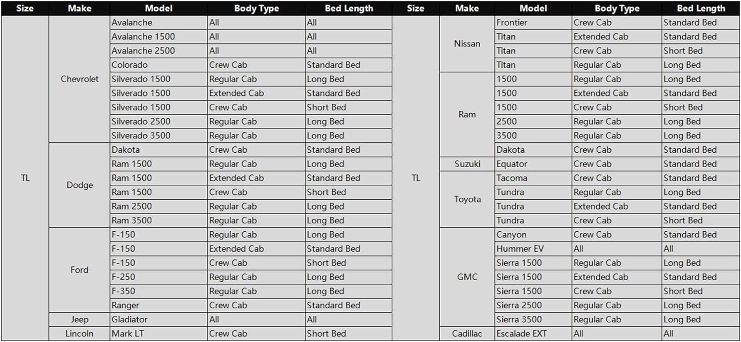 - Material 300D Oxford : Vehicle Service Type Truck, Cadillac Escalade EXT, Chevrolet Colorado Avalanche Silverado 1500/2500/3500,Dodge Dakota, Ford F150/250/350 Maverick Ranger, GMC Canyon Sierra 1500/2500/3500, Ram 1500/2500/3500, Hummer H3T, Nissan Frontier Titan, Suzuki Equator, Toyota Tacoma Tundra, Honda Ridgeline, GMC Hummer EV Pickup, Jeep Gladiator Truck, Cadillac Escalade EXT, Chevrolet Colorado Avalanche Silverado 1500/2500/3500,Dodge Dakota, Ford⊠See more