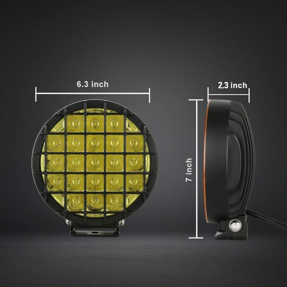 - ăEfficient lighting effectăEach light cup is combined with spot and flood beam design. Spot beam travels quite far out and has a nice width. The amber offroad lights emits super bright amber light. Round led off road lights give safe view in most of bad weathers like rainy days, foggy days and snowy days, make driving safer.