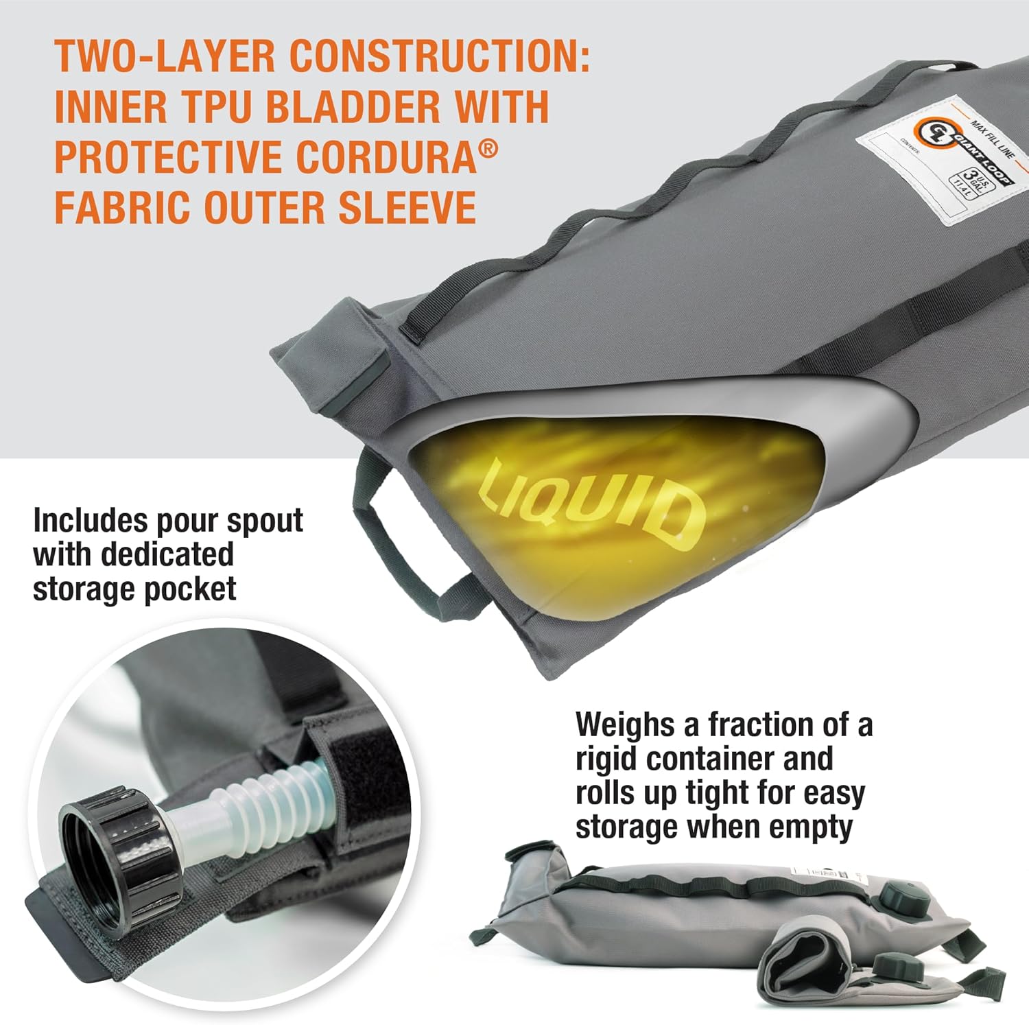 - DURABLE MATERIAL: Employs a two-layer construction, including an RF-welded inner bladder thatβs protected by a highly abrasion resistant sewn Cordura outer sleeve; The bag also features webbing and rubber-molded handles that make filling and installing the pour spout and dispensing liquids easier