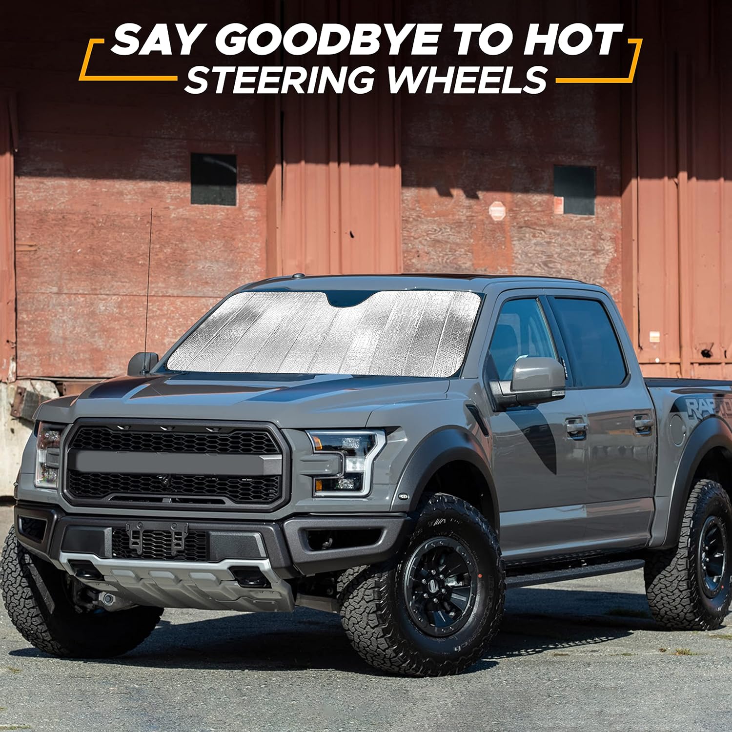 - Premium Durability for Long-Lasting Use: Crafted from durable reflective aluminum foil with a double-layered bubble sheet, this accordion windshield sun shade offers exceptional durability. Its superior construction provides a perfect fit for your large SUV or pickup truck, effectively blocking sun heat rays and UV rays to protect your vehicle for the long haul.