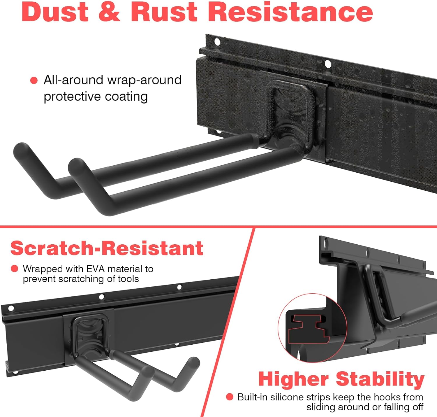 - Garage Tool Organizer for Yard Garden Lawn: It contains 4 packs of 16-inch Aluminum wall rails, 2 packs of Steel single hook, and 8 packs of Steel Twin hook, which can protect your tools from slid and damage