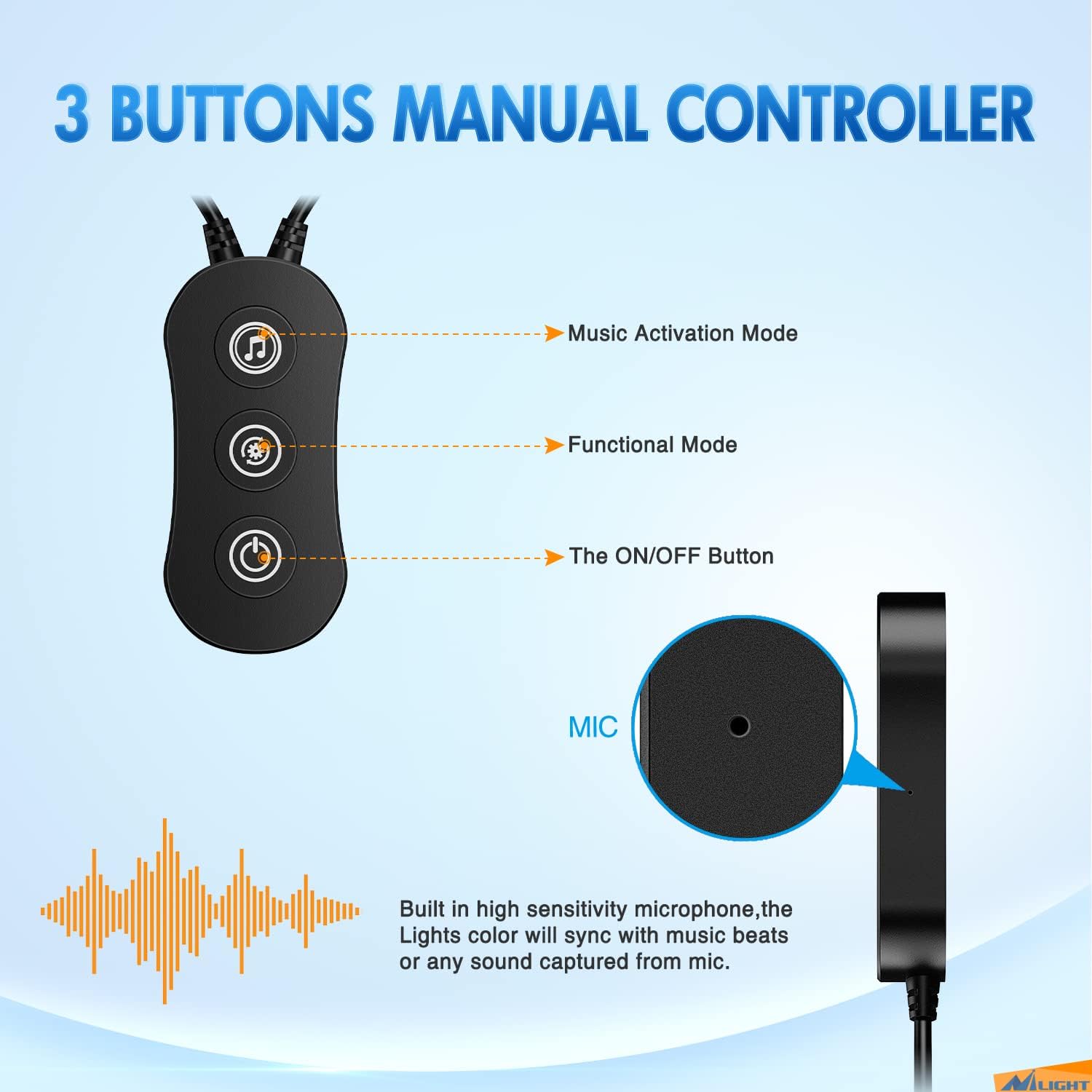 - Dual controller: You can use the manual controller and the smart Happy Light APP to select the color mode and music dynamic mode you want:DIY color, scene mode selection, music mode, timing Settings, rhythm.