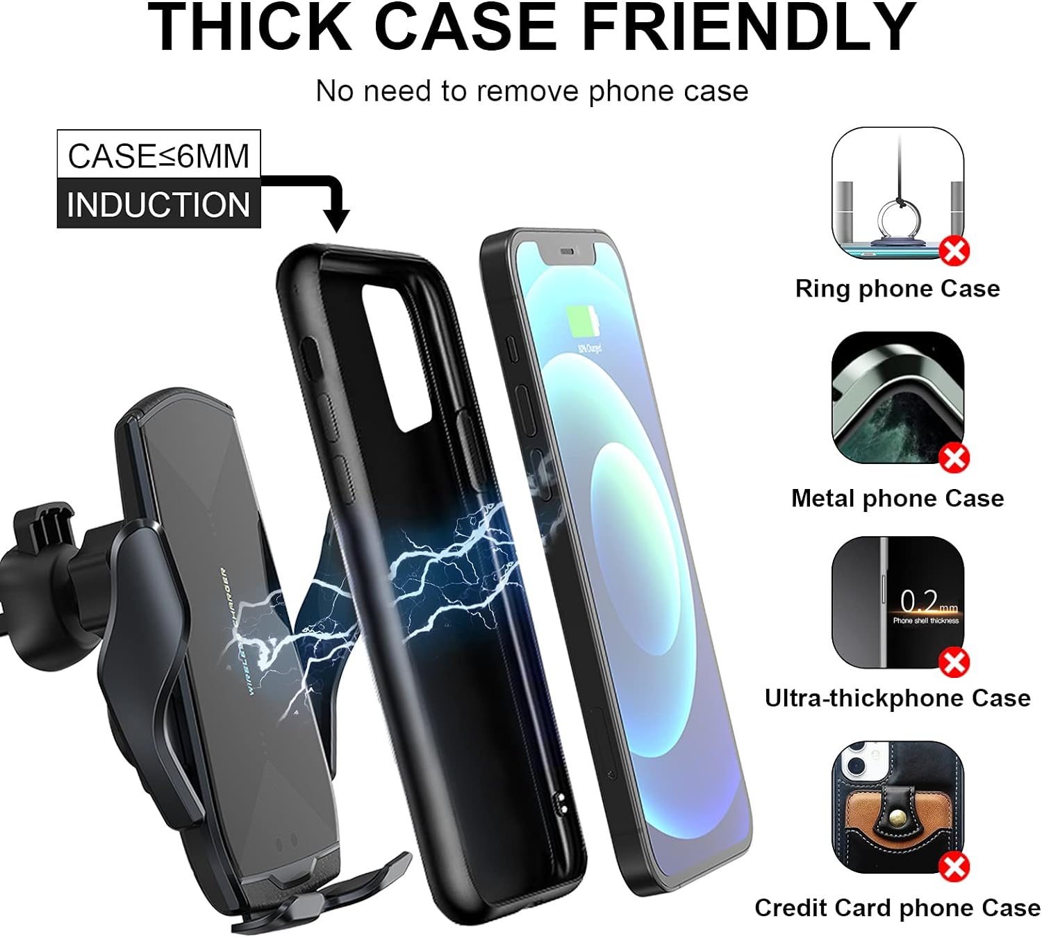 - safety standard:The car charger provides multiple protections, with functions such as anti-overcurrent, anti-overheating, anti-short circuit, anti-overvoltage, etc., to ensure charging safety.Our wireless car charger holder is 100% compliant with the EU standards and has received national certifications of Qi, CE, FCC and ROHS standards