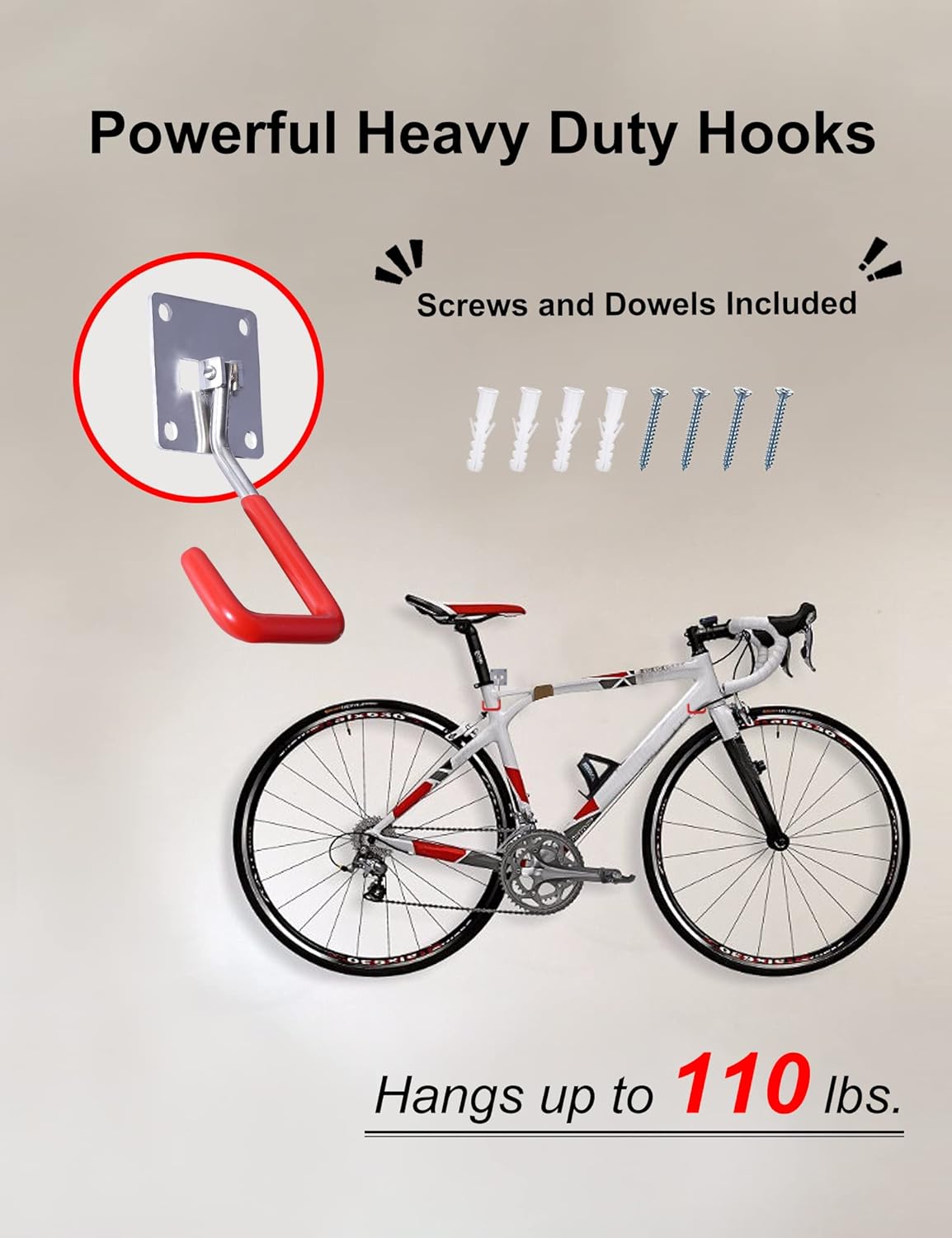 - EASY TO INSTALL: These garage hooks are applicable to all kinds of walls and wood materials and other installation surfaces.Three easy steps๏ผ 1) Mark two small holes on the wall; 2) Fix the white plastic anchor to the desired; 3) Twist the steel screw nail into the anchor.